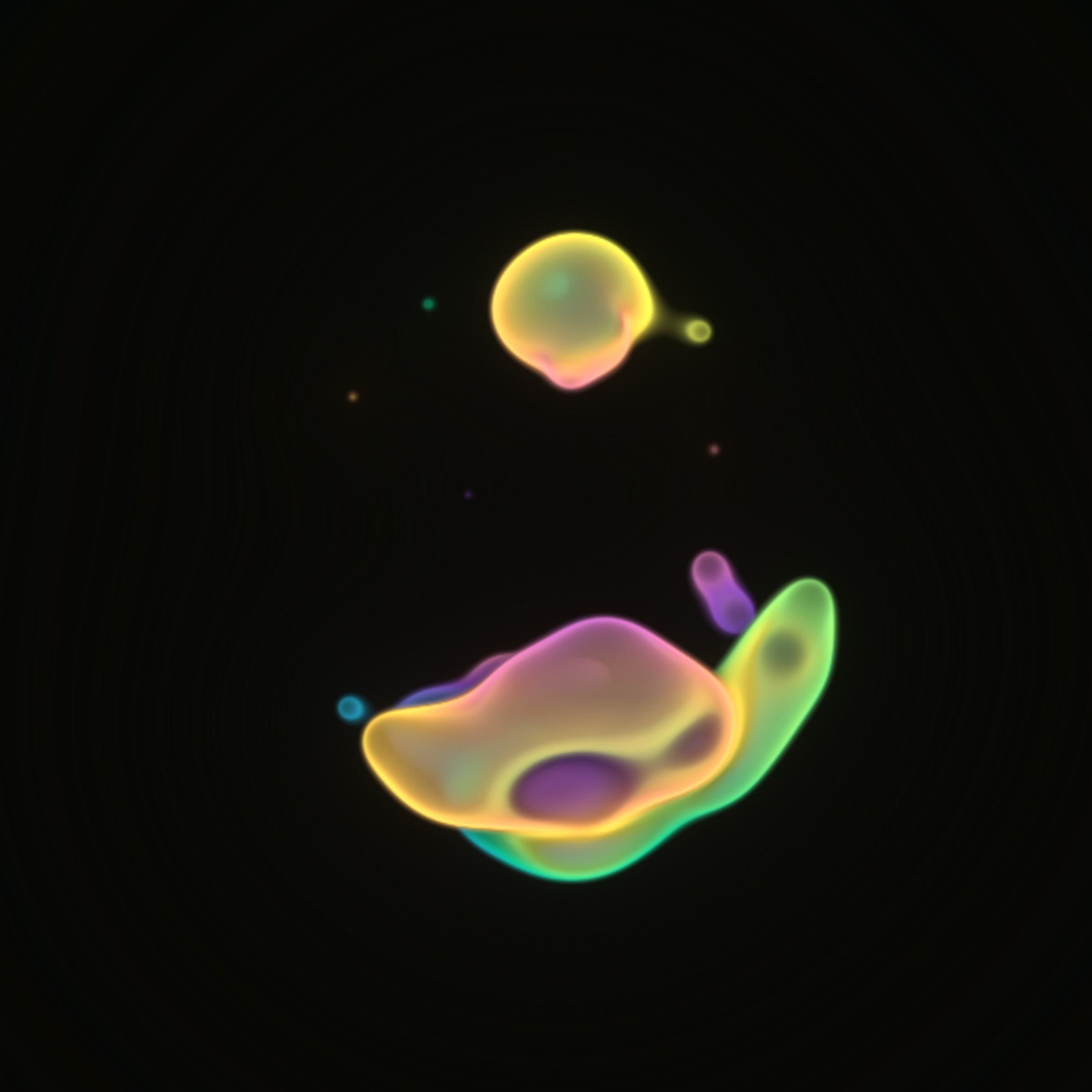 Translucent color bubbles playfully mix and morph to create organic and ephemeral blobby forms. [Shortcuts] spacebar: pause/resume, s: save screenshot, 1→5: high→low resolution. If needed, please adjust resolution or window size for optimal performance.