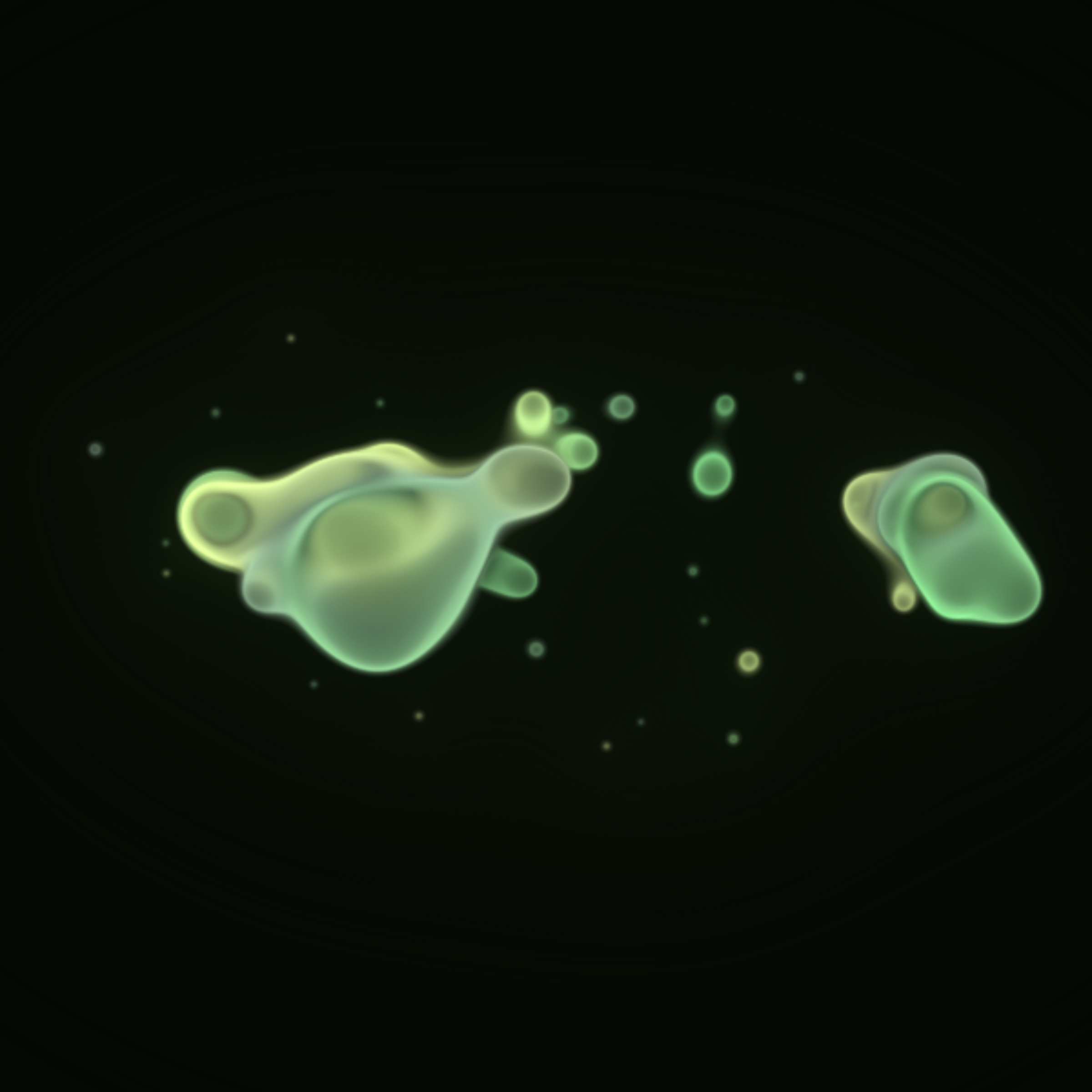Translucent color bubbles playfully mix and morph to create organic and ephemeral blobby forms. [Shortcuts] spacebar: pause/resume, s: save screenshot, 1→5: high→low resolution. If needed, please adjust resolution or window size for optimal performance.