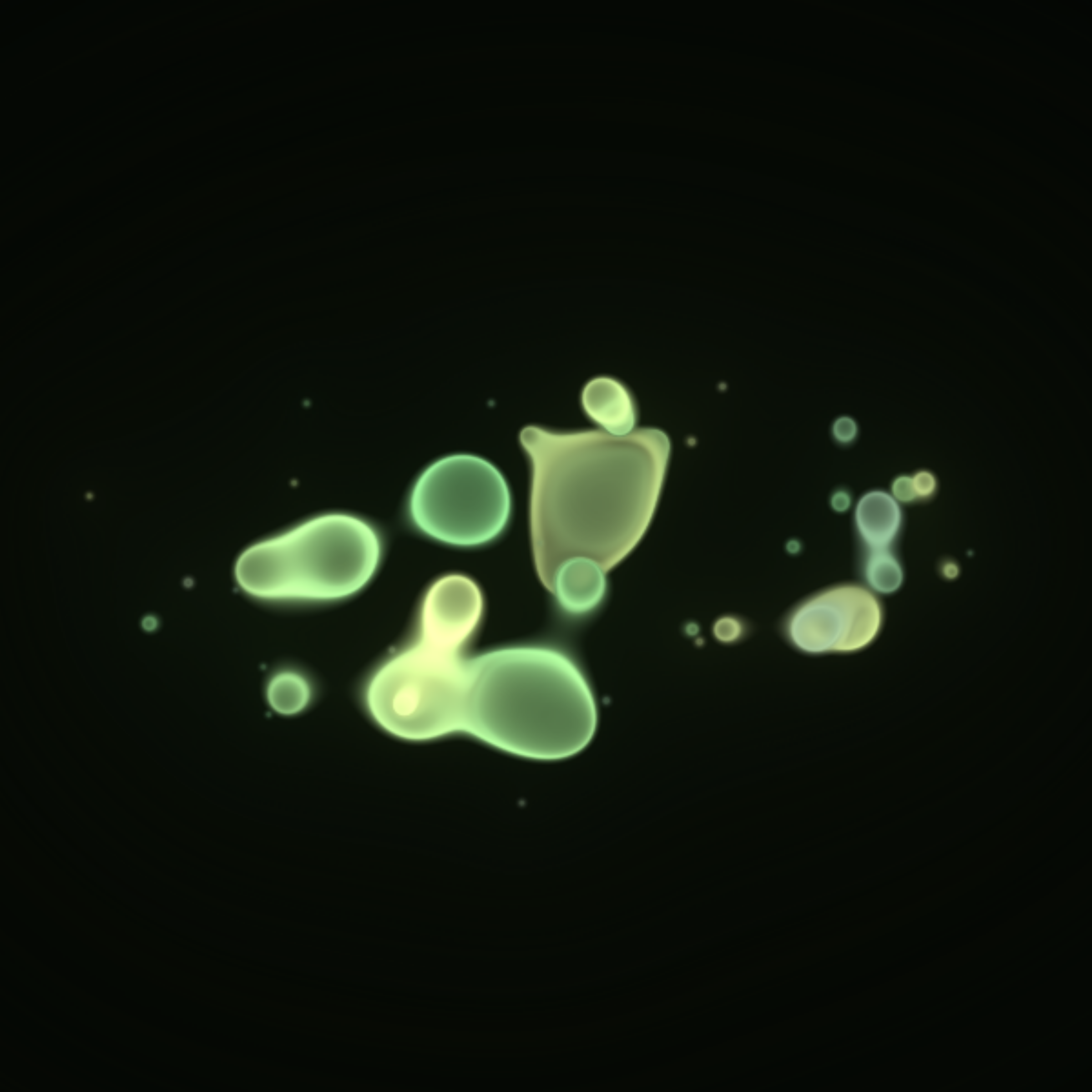 Translucent color bubbles playfully mix and morph to create organic and ephemeral blobby forms. [Shortcuts] spacebar: pause/resume, s: save screenshot, 1→5: high→low resolution. If needed, please adjust resolution or window size for optimal performance.