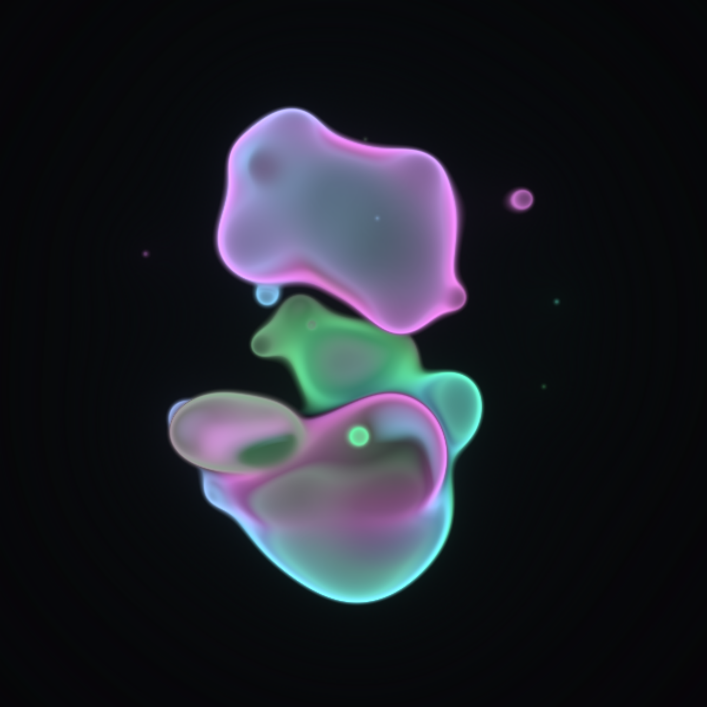 Translucent color bubbles playfully mix and morph to create organic and ephemeral blobby forms. [Shortcuts] spacebar: pause/resume, s: save screenshot, 1→5: high→low resolution. If needed, please adjust resolution or window size for optimal performance.