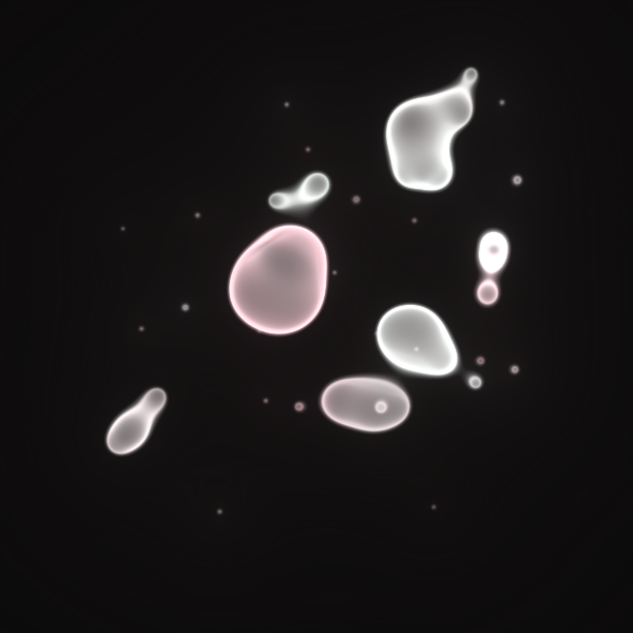 Translucent color bubbles playfully mix and morph to create organic and ephemeral blobby forms. [Shortcuts] spacebar: pause/resume, s: save screenshot, 1→5: high→low resolution. If needed, please adjust resolution or window size for optimal performance.