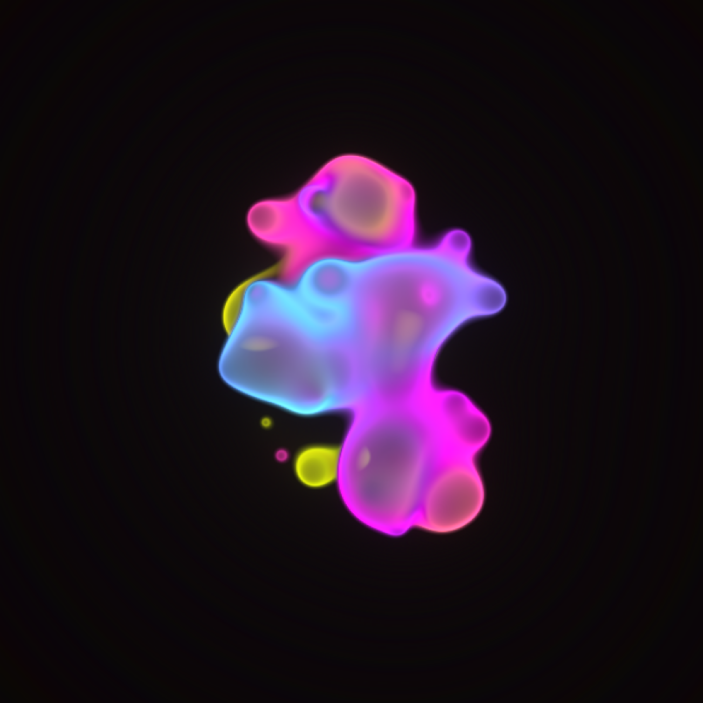 Translucent color bubbles playfully mix and morph to create organic and ephemeral blobby forms. [Shortcuts] spacebar: pause/resume, s: save screenshot, 1→5: high→low resolution. If needed, please adjust resolution or window size for optimal performance.