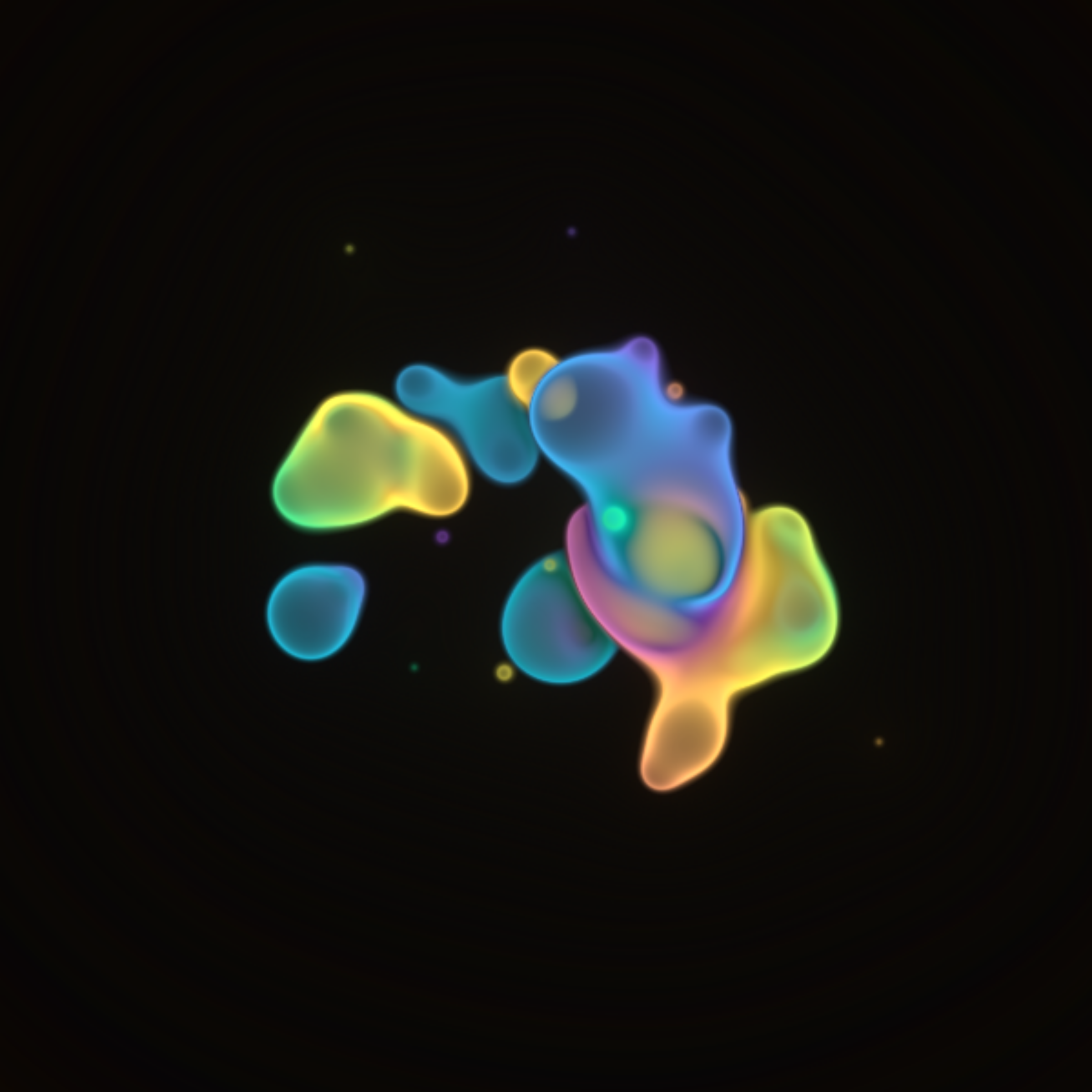 Translucent color bubbles playfully mix and morph to create organic and ephemeral blobby forms. [Shortcuts] spacebar: pause/resume, s: save screenshot, 1→5: high→low resolution. If needed, please adjust resolution or window size for optimal performance.