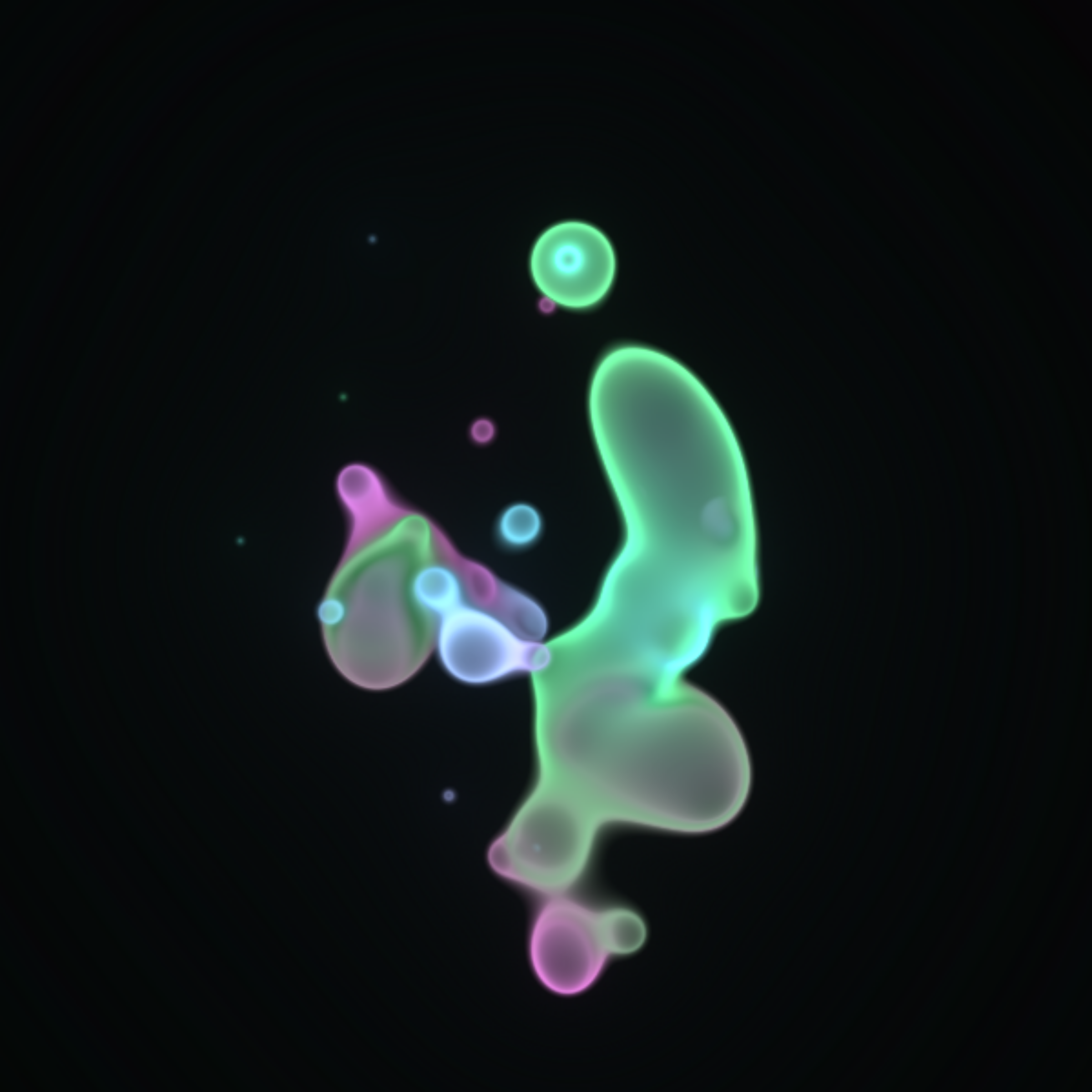 Translucent color bubbles playfully mix and morph to create organic and ephemeral blobby forms. [Shortcuts] spacebar: pause/resume, s: save screenshot, 1→5: high→low resolution. If needed, please adjust resolution or window size for optimal performance.