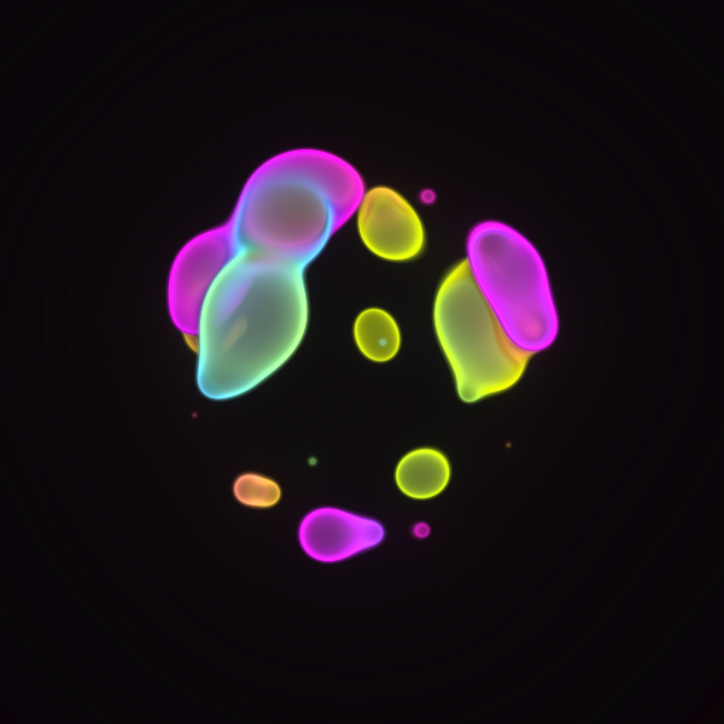 Translucent color bubbles playfully mix and morph to create organic and ephemeral blobby forms. [Shortcuts] spacebar: pause/resume, s: save screenshot, 1→5: high→low resolution. If needed, please adjust resolution or window size for optimal performance.