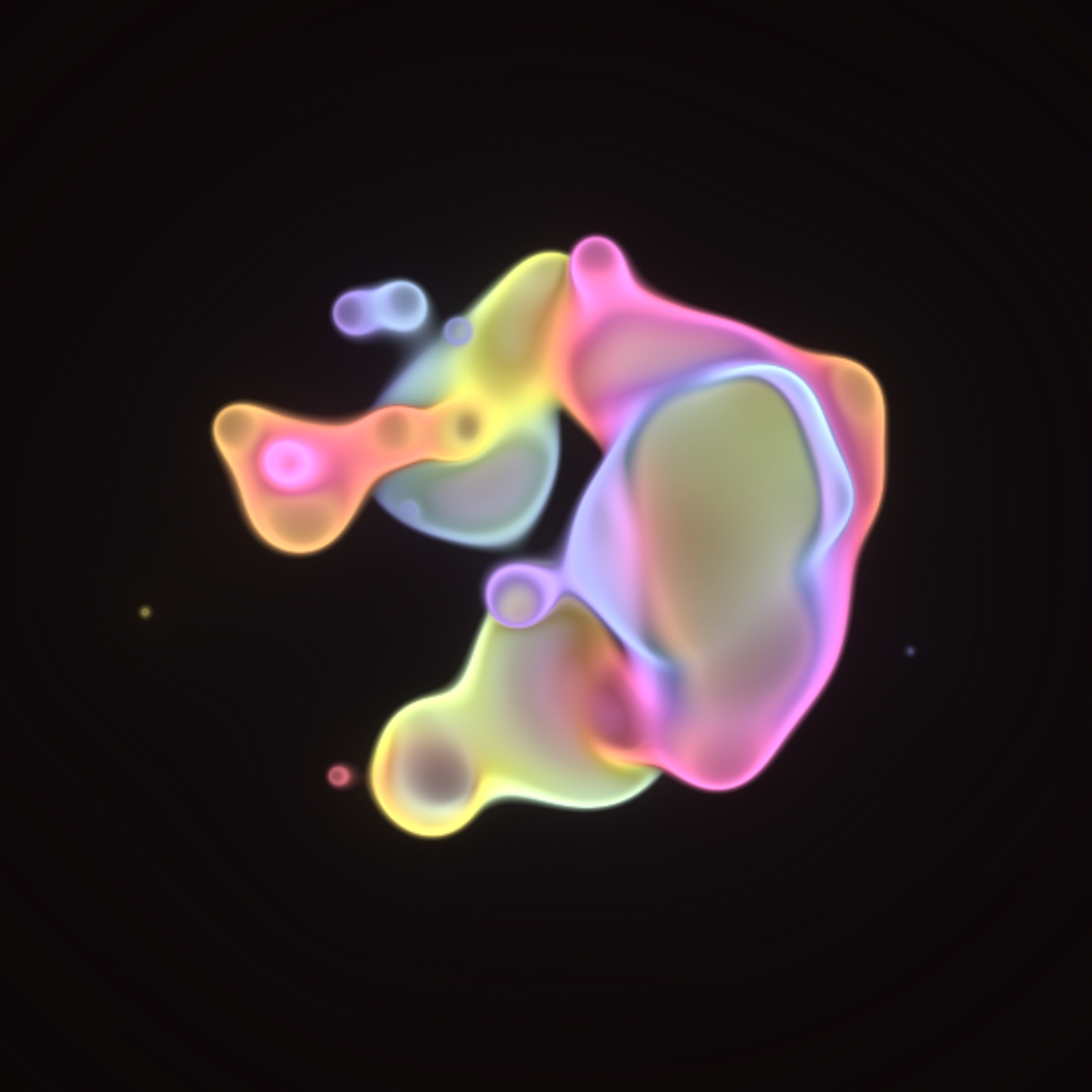 Translucent color bubbles playfully mix and morph to create organic and ephemeral blobby forms. [Shortcuts] spacebar: pause/resume, s: save screenshot, 1→5: high→low resolution. If needed, please adjust resolution or window size for optimal performance.