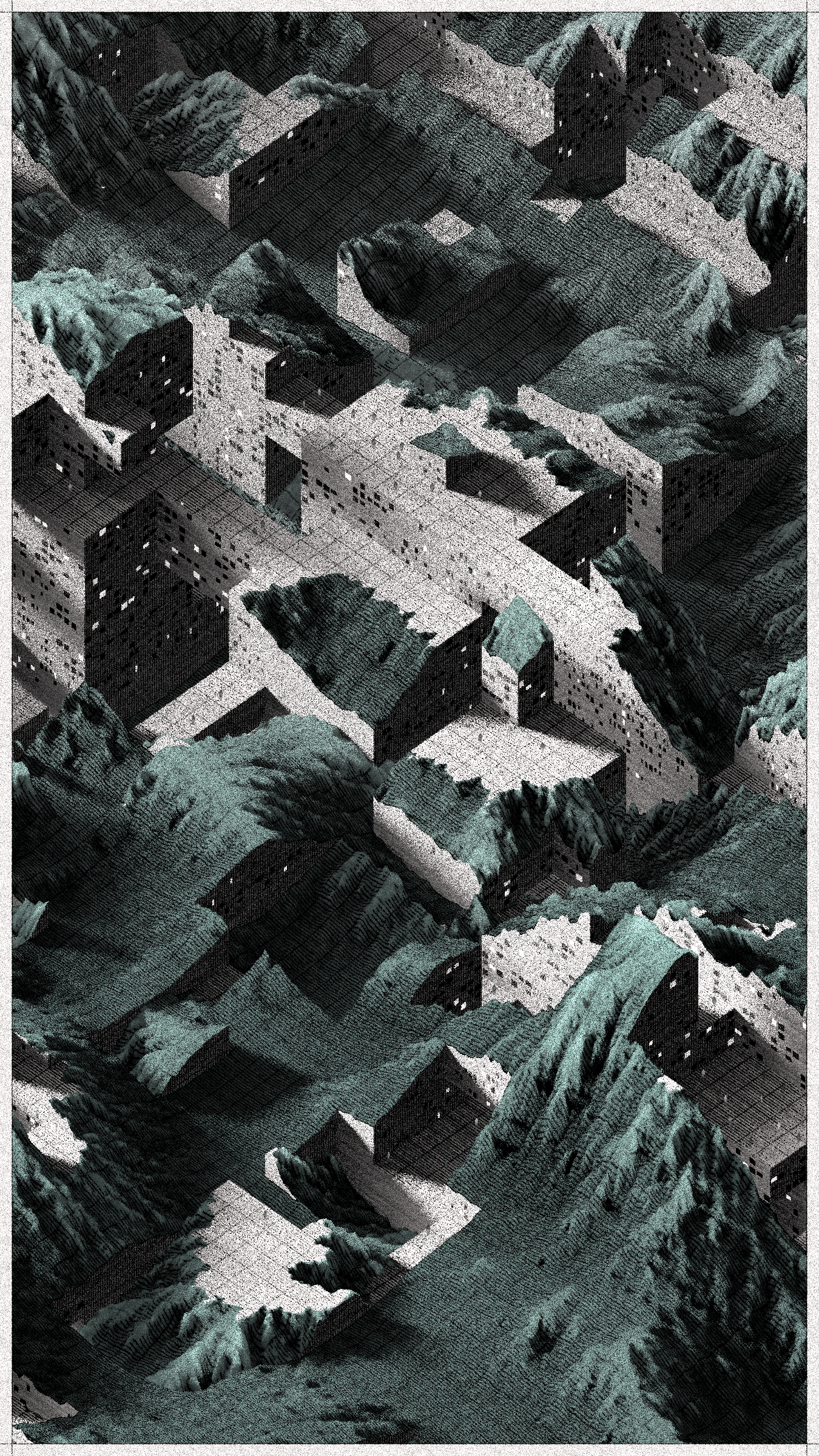 Cantera is a project that brings these stories to a non-physical, generative space. It replaces atoms of stone and soil with digital bits. It draws landscapes inspired by the imagery of Basque stone quarries and iron mines and writes narratives about non-existent habitats where the boundaries between extraction, shelter, and natural forms become indistinct.
