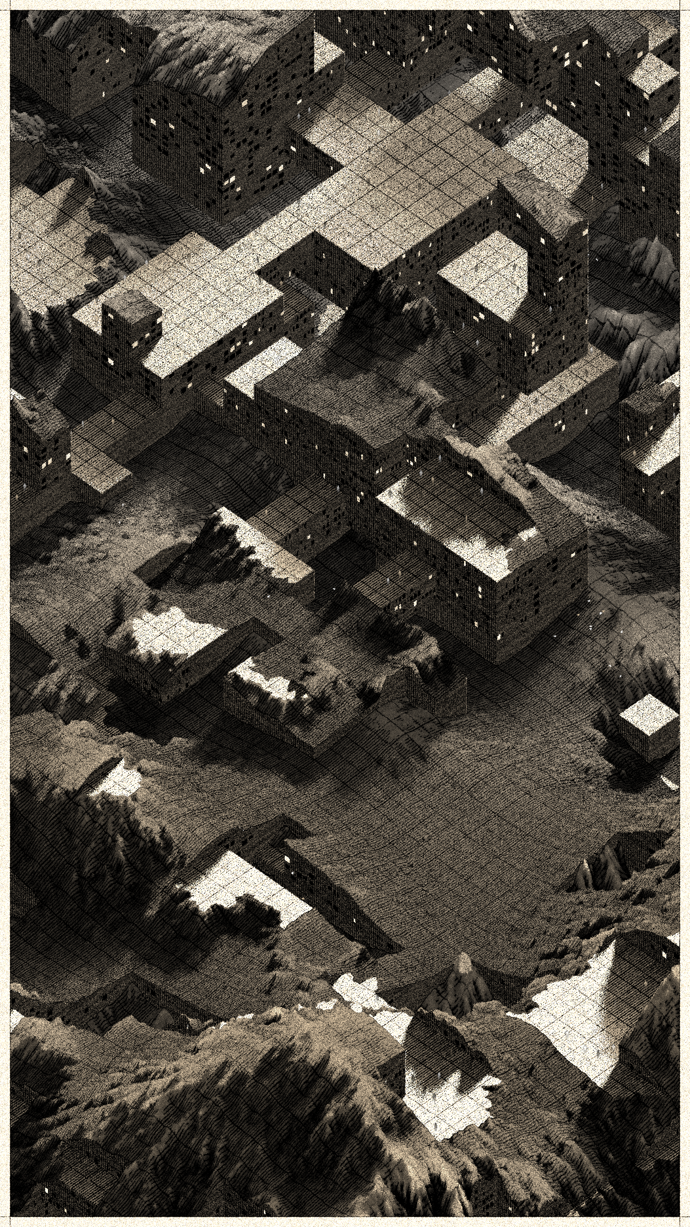 Cantera is a project that brings these stories to a non-physical, generative space. It replaces atoms of stone and soil with digital bits. It draws landscapes inspired by the imagery of Basque stone quarries and iron mines and writes narratives about non-existent habitats where the boundaries between extraction, shelter, and natural forms become indistinct.