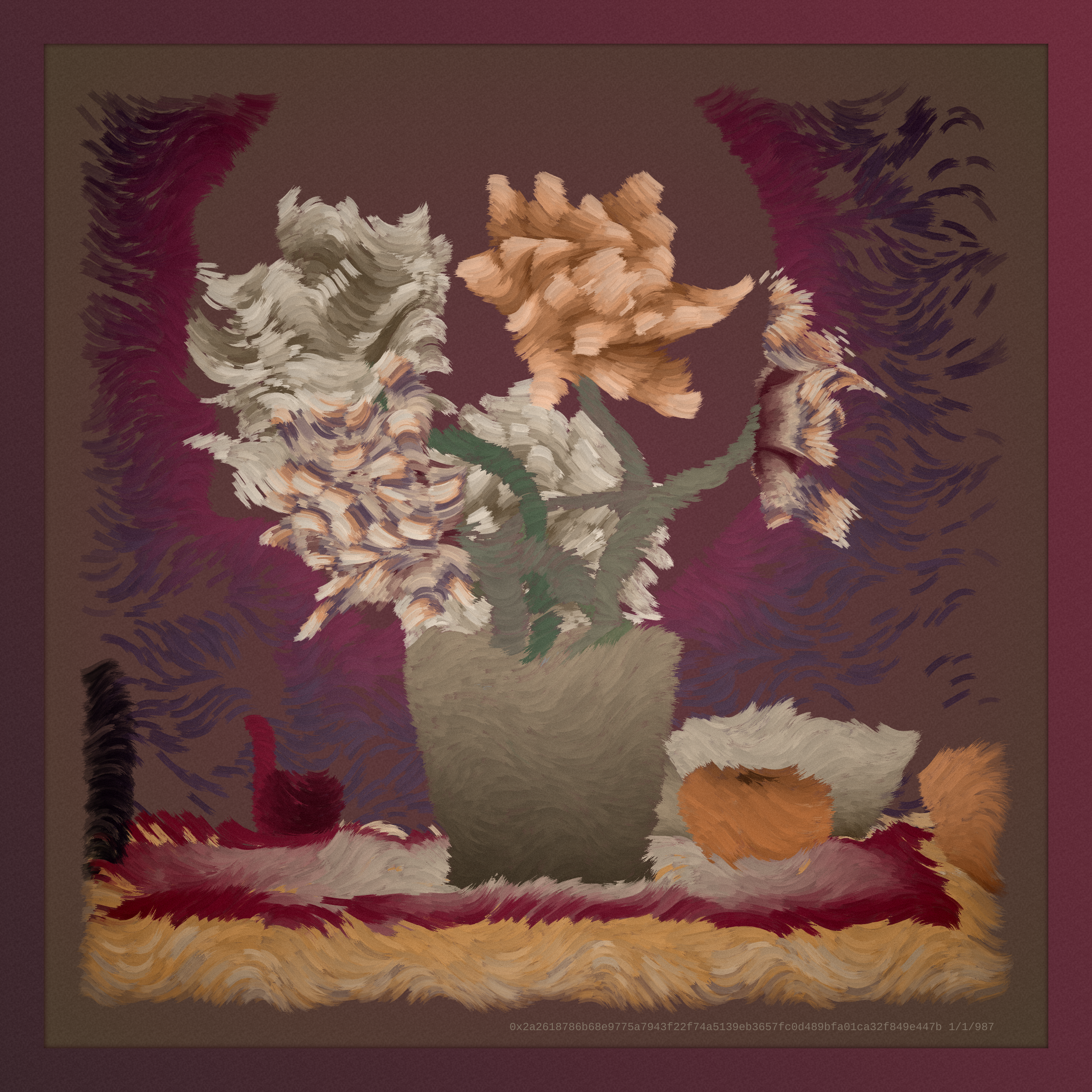 Chimera is a natural progression of still life. It is an old tradition in the very new medium of on-chain generative art, a movement that will have an enormous presence in the future. Chimera simultaneously reaches into the past while exploiting the capabilities of the present and seeks to represent a unique moment in time, a generation of art in between digital and physical realities, encapsulating where we came from and where we are going.