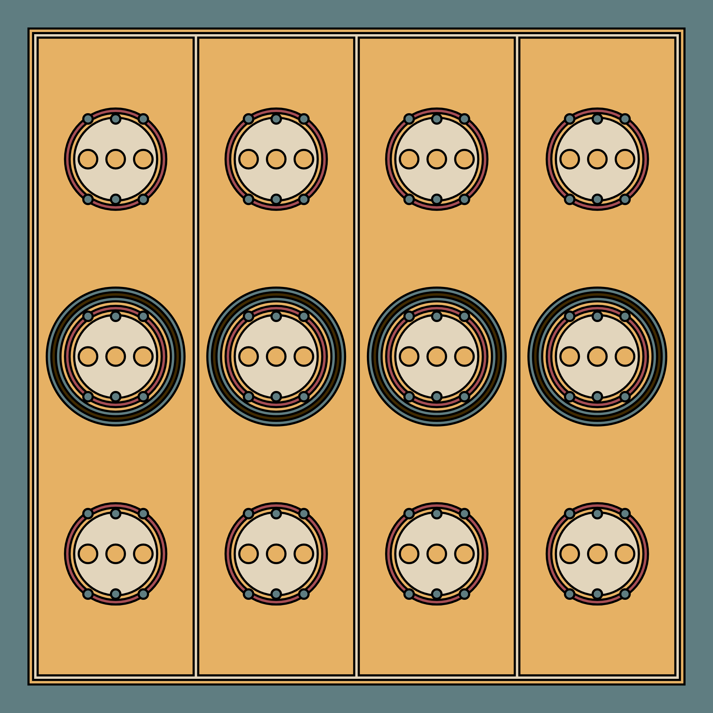 A study in composition using simple shapes and layout rules. When repetitive patterns fail, and the symmetry isn't quite right, the images are strangely evocative. Somewhere between art deco, pop art, and sci-fi.