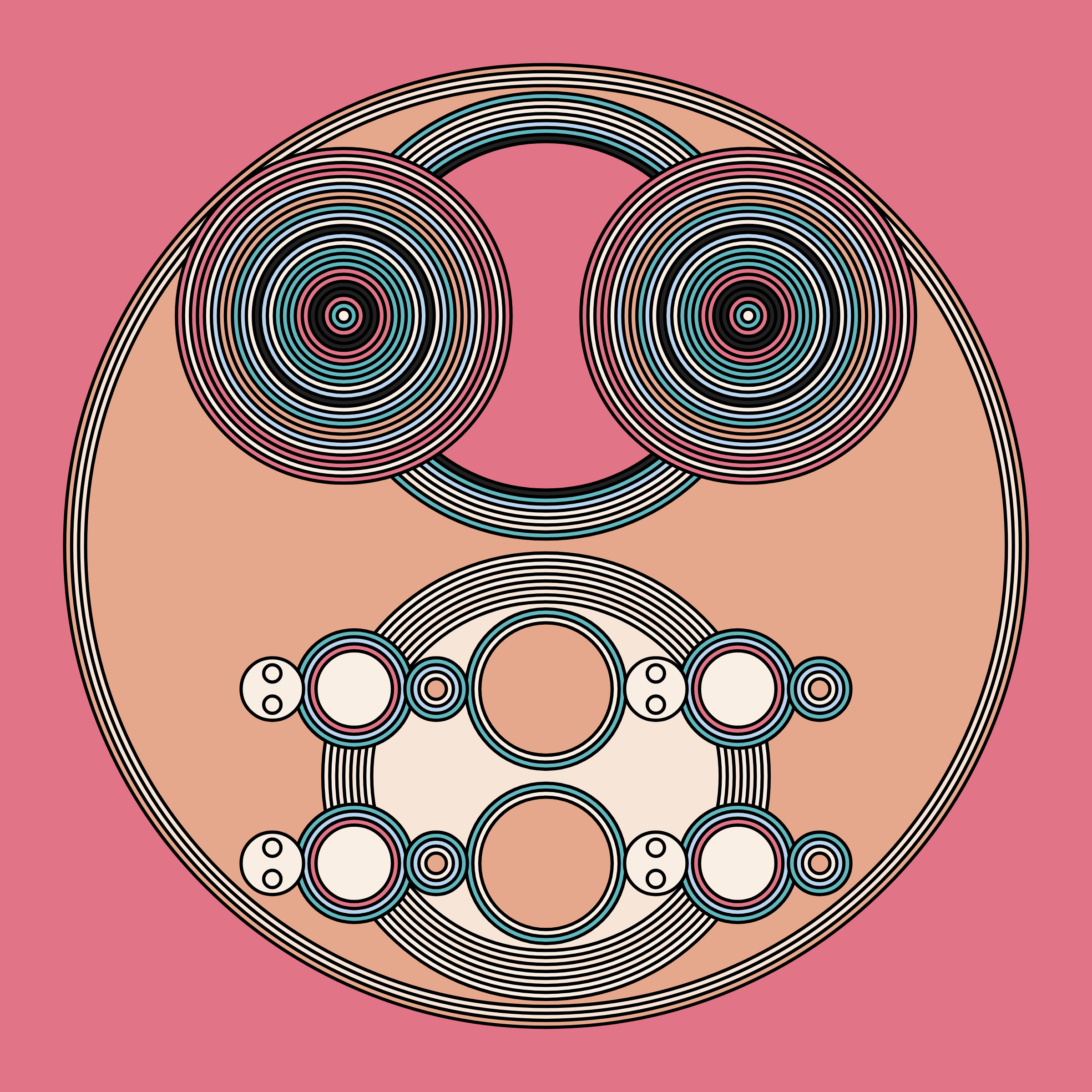 A study in composition using simple shapes and layout rules. When repetitive patterns fail, and the symmetry isn't quite right, the images are strangely evocative. Somewhere between art deco, pop art, and sci-fi.