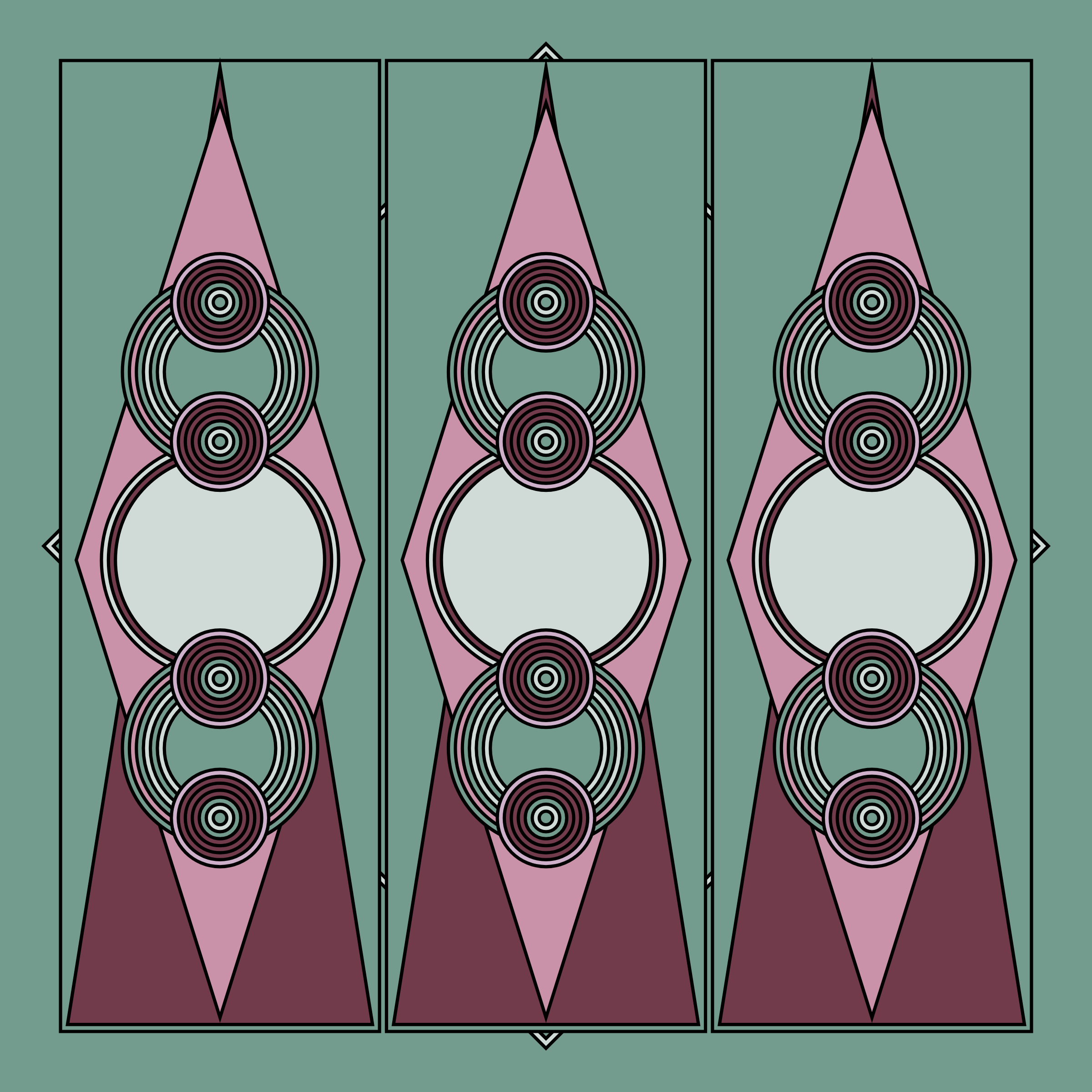 A study in composition using simple shapes and layout rules. When repetitive patterns fail, and the symmetry isn't quite right, the images are strangely evocative. Somewhere between art deco, pop art, and sci-fi.