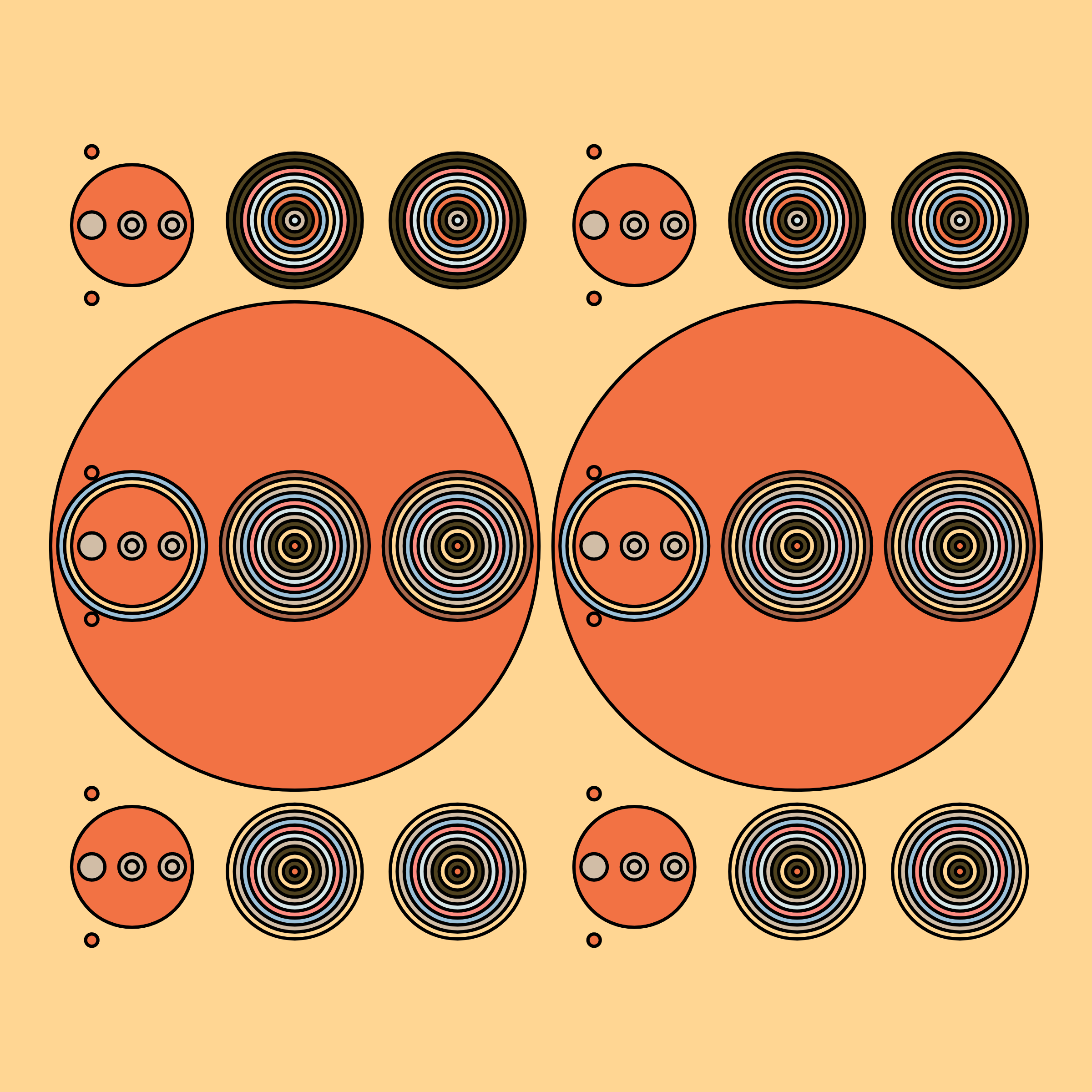 A study in composition using simple shapes and layout rules. When repetitive patterns fail, and the symmetry isn't quite right, the images are strangely evocative. Somewhere between art deco, pop art, and sci-fi.