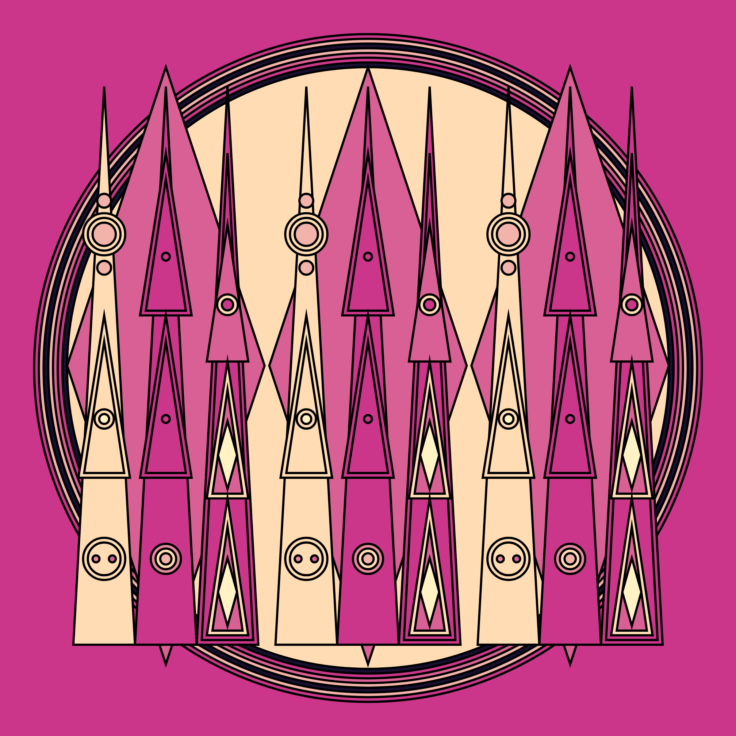 A study in composition using simple shapes and layout rules. When repetitive patterns fail, and the symmetry isn't quite right, the images are strangely evocative. Somewhere between art deco, pop art, and sci-fi.