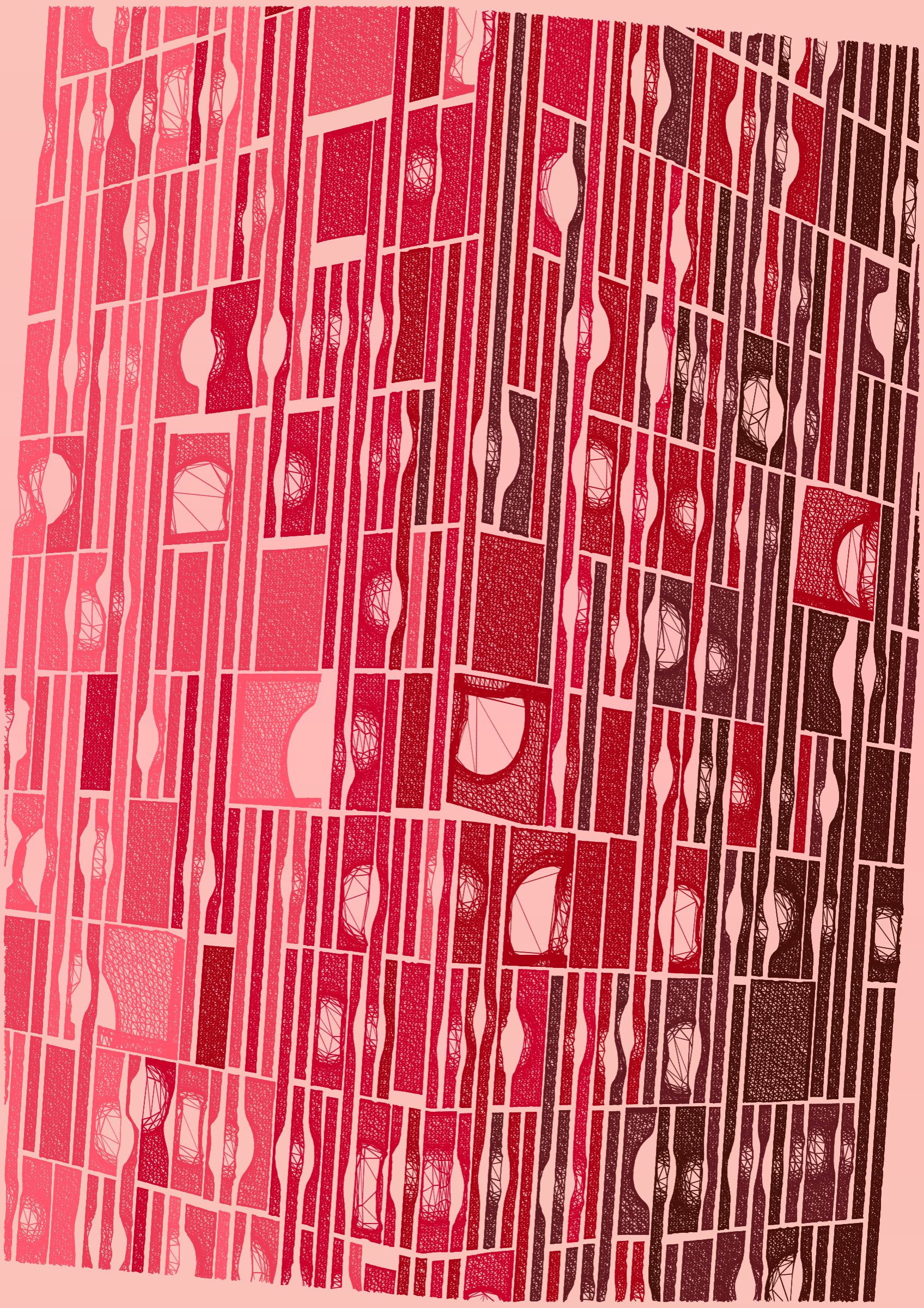 "Edifice" is a series of 976 massive, deteriorating structures built on strange terrain. It is an exploration of buildings being conceptualized, constructed, and eroded away under a wide variety of conditions. Edifice's outputs run the gamut between minimal and maximal, with some showing few large, static blocks of color, and others many small, highly textured and warped shapes. Each image is progressively constructed in front of the viewer's eyes. It is a system full of surprises that I'm excited to share with the world.