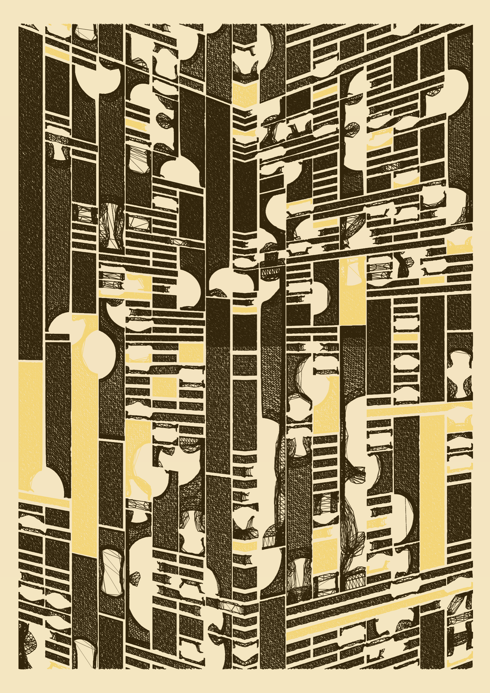 "Edifice" is a series of 976 massive, deteriorating structures built on strange terrain. It is an exploration of buildings being conceptualized, constructed, and eroded away under a wide variety of conditions. Edifice's outputs run the gamut between minimal and maximal, with some showing few large, static blocks of color, and others many small, highly textured and warped shapes. Each image is progressively constructed in front of the viewer's eyes. It is a system full of surprises that I'm excited to share with the world.