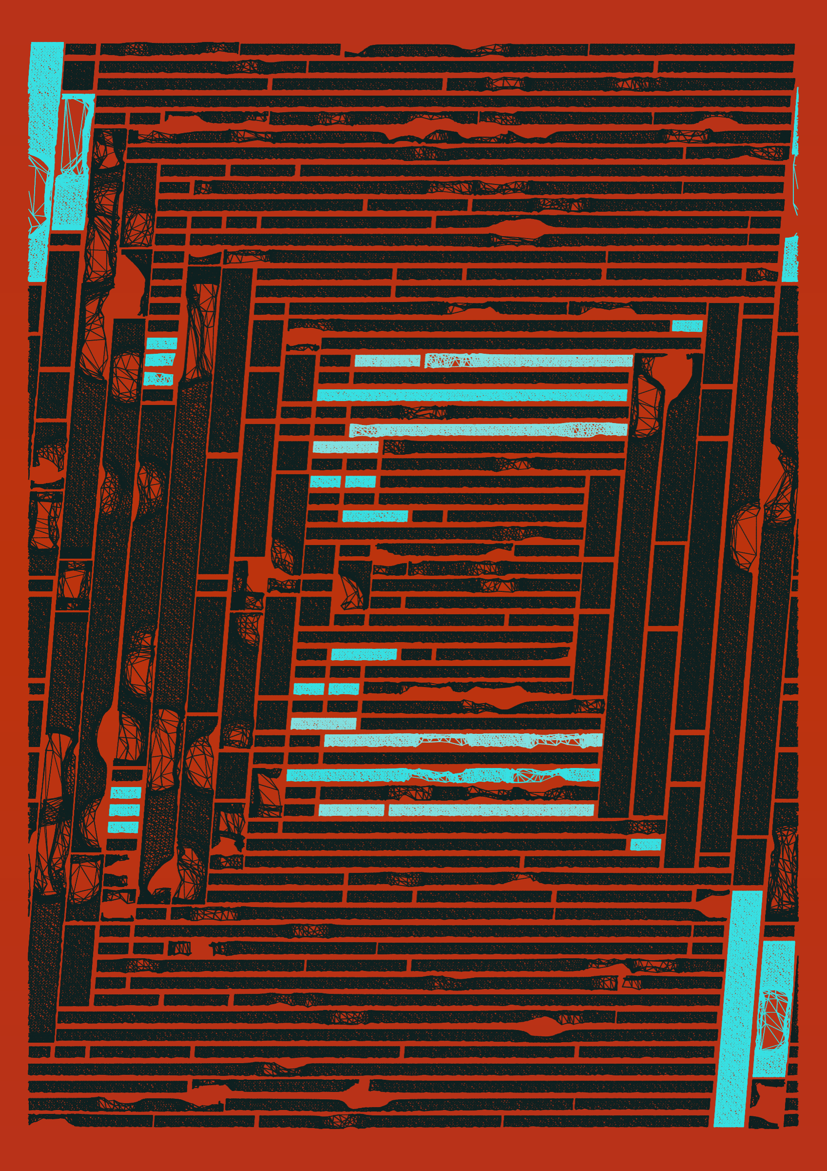 "Edifice" is a series of 976 massive, deteriorating structures built on strange terrain. It is an exploration of buildings being conceptualized, constructed, and eroded away under a wide variety of conditions. Edifice's outputs run the gamut between minimal and maximal, with some showing few large, static blocks of color, and others many small, highly textured and warped shapes. Each image is progressively constructed in front of the viewer's eyes. It is a system full of surprises that I'm excited to share with the world.