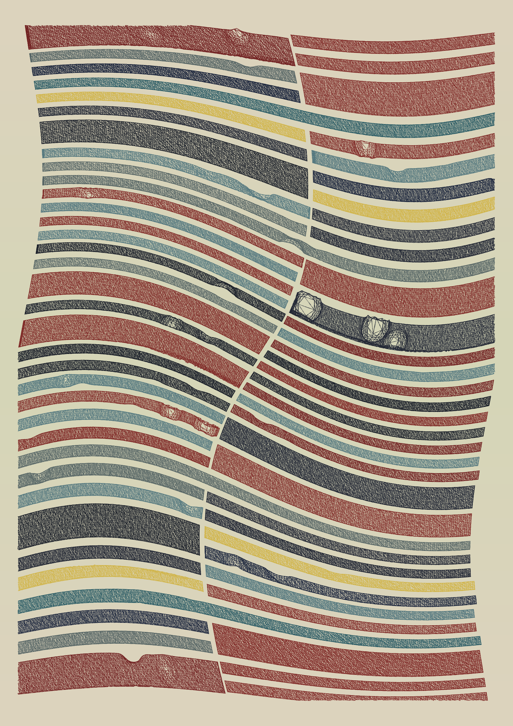 "Edifice" is a series of 976 massive, deteriorating structures built on strange terrain. It is an exploration of buildings being conceptualized, constructed, and eroded away under a wide variety of conditions. Edifice's outputs run the gamut between minimal and maximal, with some showing few large, static blocks of color, and others many small, highly textured and warped shapes. Each image is progressively constructed in front of the viewer's eyes. It is a system full of surprises that I'm excited to share with the world.