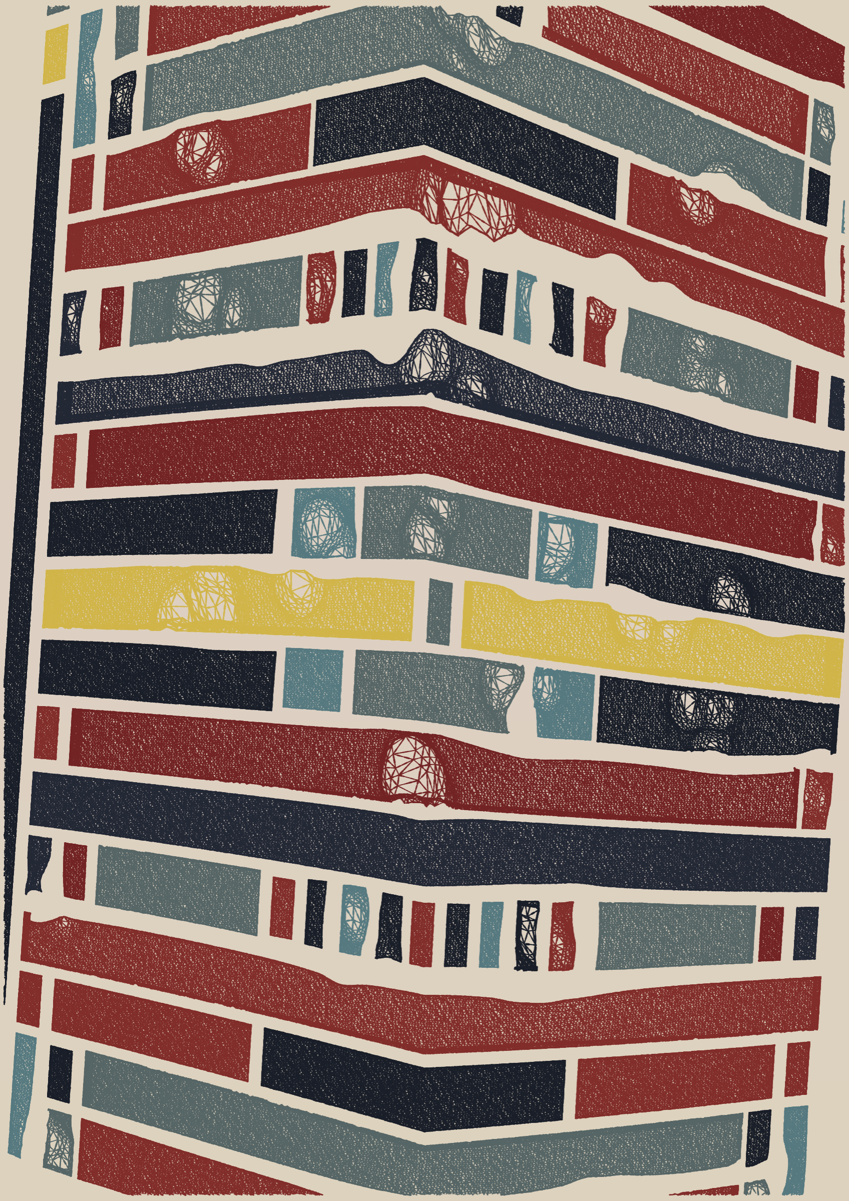 "Edifice" is a series of 976 massive, deteriorating structures built on strange terrain. It is an exploration of buildings being conceptualized, constructed, and eroded away under a wide variety of conditions. Edifice's outputs run the gamut between minimal and maximal, with some showing few large, static blocks of color, and others many small, highly textured and warped shapes. Each image is progressively constructed in front of the viewer's eyes. It is a system full of surprises that I'm excited to share with the world.