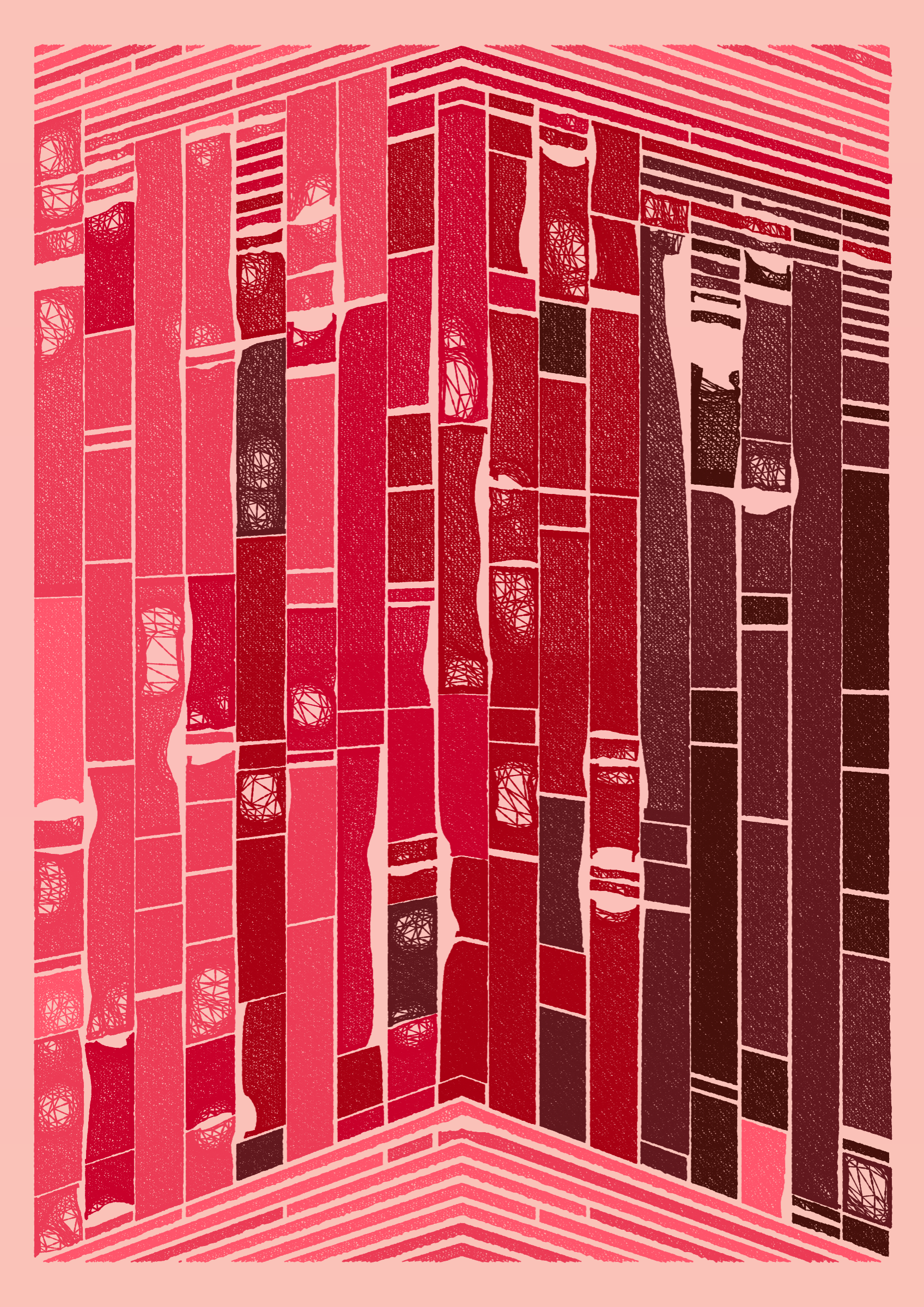 "Edifice" is a series of 976 massive, deteriorating structures built on strange terrain. It is an exploration of buildings being conceptualized, constructed, and eroded away under a wide variety of conditions. Edifice's outputs run the gamut between minimal and maximal, with some showing few large, static blocks of color, and others many small, highly textured and warped shapes. Each image is progressively constructed in front of the viewer's eyes. It is a system full of surprises that I'm excited to share with the world.