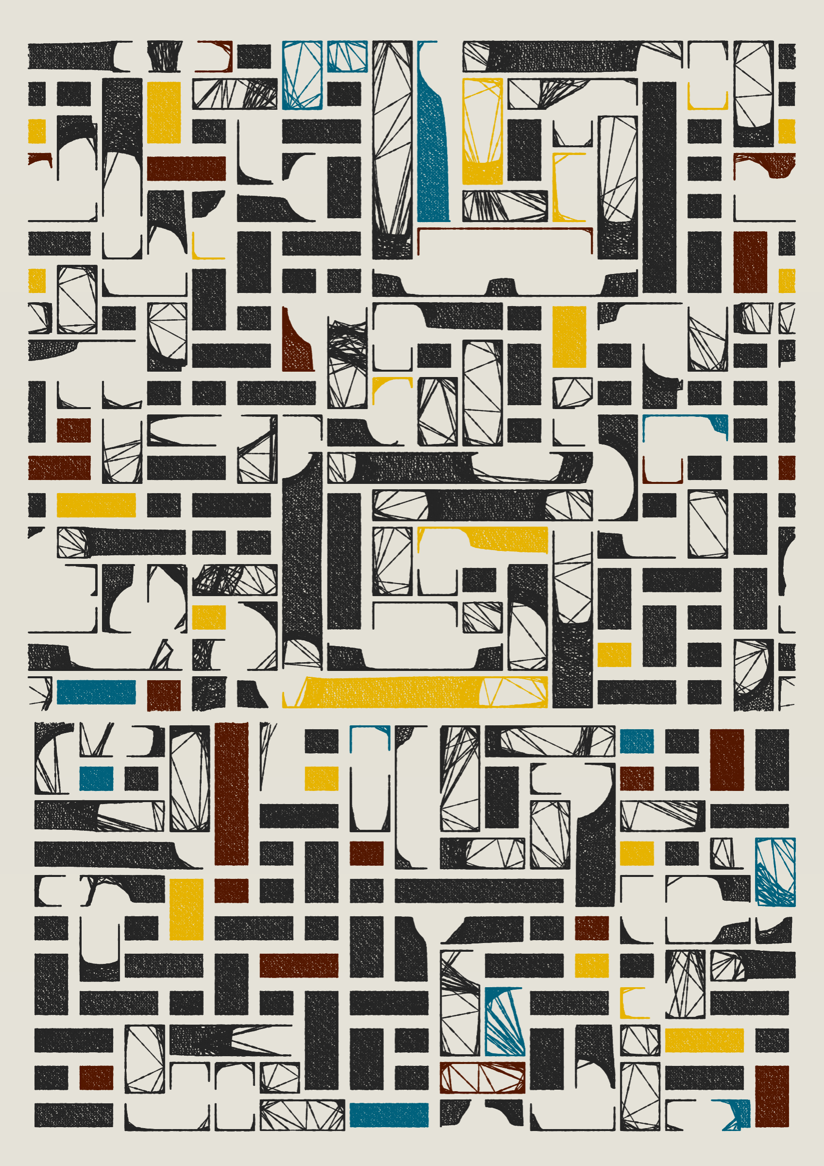 "Edifice" is a series of 976 massive, deteriorating structures built on strange terrain. It is an exploration of buildings being conceptualized, constructed, and eroded away under a wide variety of conditions. Edifice's outputs run the gamut between minimal and maximal, with some showing few large, static blocks of color, and others many small, highly textured and warped shapes. Each image is progressively constructed in front of the viewer's eyes. It is a system full of surprises that I'm excited to share with the world.