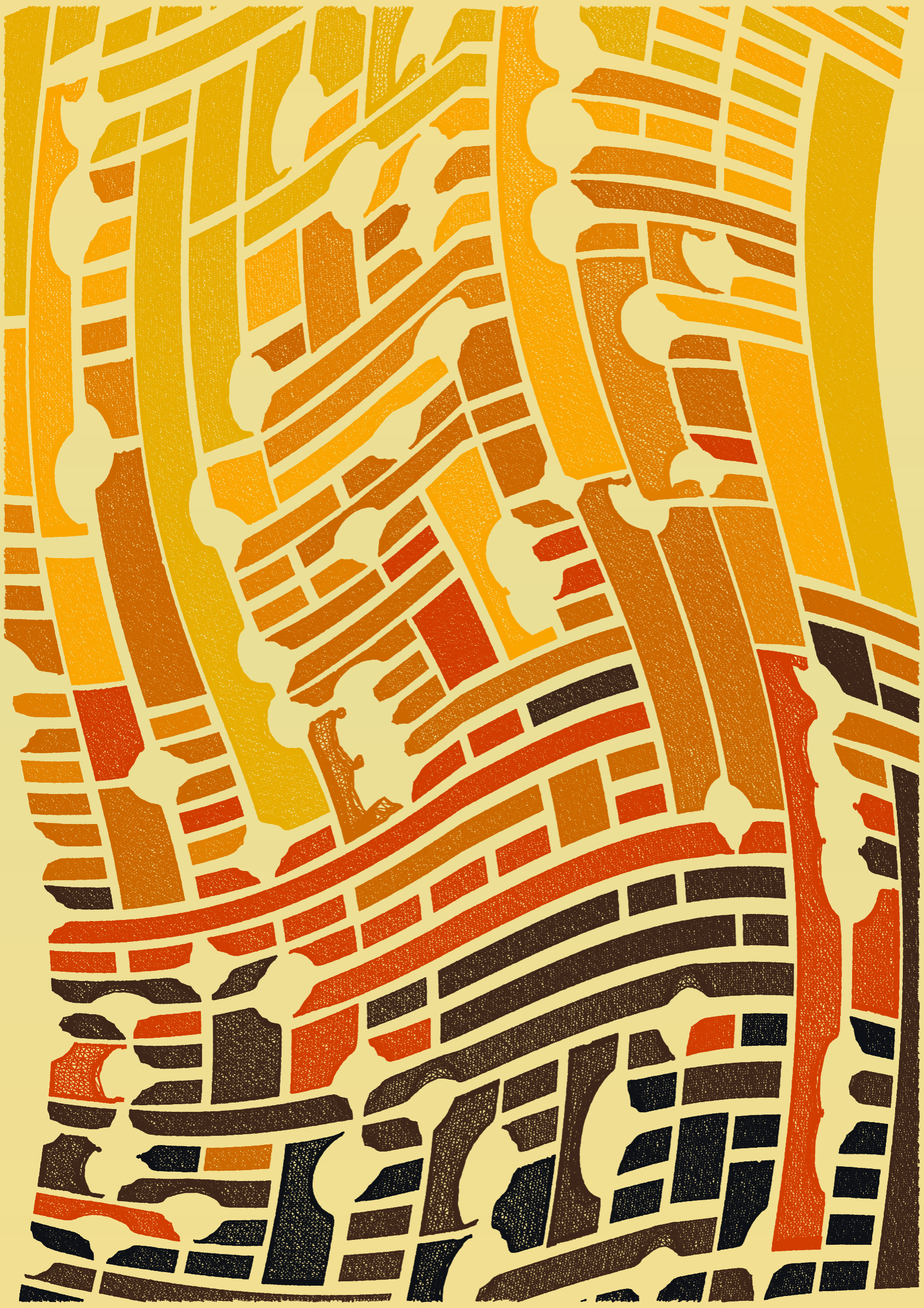 "Edifice" is a series of 976 massive, deteriorating structures built on strange terrain. It is an exploration of buildings being conceptualized, constructed, and eroded away under a wide variety of conditions. Edifice's outputs run the gamut between minimal and maximal, with some showing few large, static blocks of color, and others many small, highly textured and warped shapes. Each image is progressively constructed in front of the viewer's eyes. It is a system full of surprises that I'm excited to share with the world.