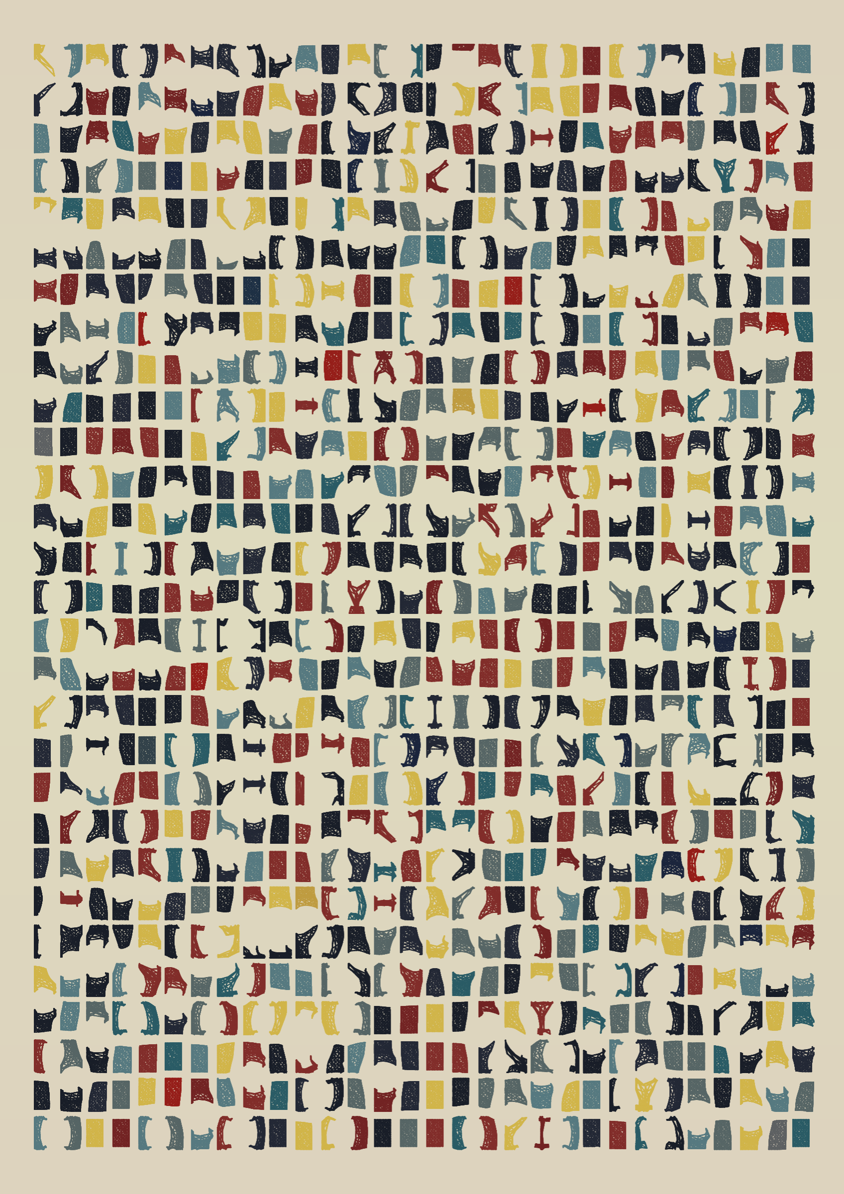 "Edifice" is a series of 976 massive, deteriorating structures built on strange terrain. It is an exploration of buildings being conceptualized, constructed, and eroded away under a wide variety of conditions. Edifice's outputs run the gamut between minimal and maximal, with some showing few large, static blocks of color, and others many small, highly textured and warped shapes. Each image is progressively constructed in front of the viewer's eyes. It is a system full of surprises that I'm excited to share with the world.