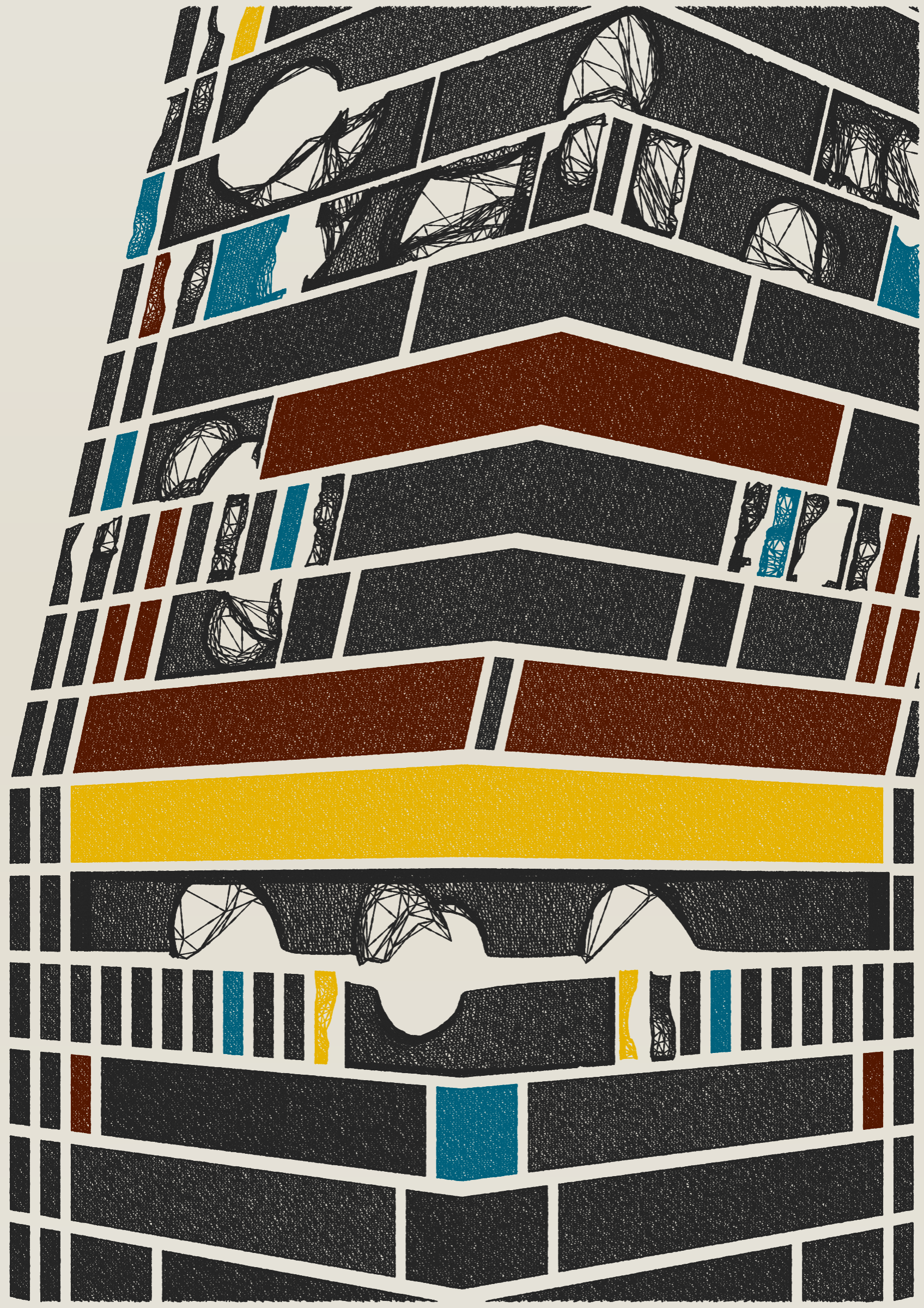"Edifice" is a series of 976 massive, deteriorating structures built on strange terrain. It is an exploration of buildings being conceptualized, constructed, and eroded away under a wide variety of conditions. Edifice's outputs run the gamut between minimal and maximal, with some showing few large, static blocks of color, and others many small, highly textured and warped shapes. Each image is progressively constructed in front of the viewer's eyes. It is a system full of surprises that I'm excited to share with the world.