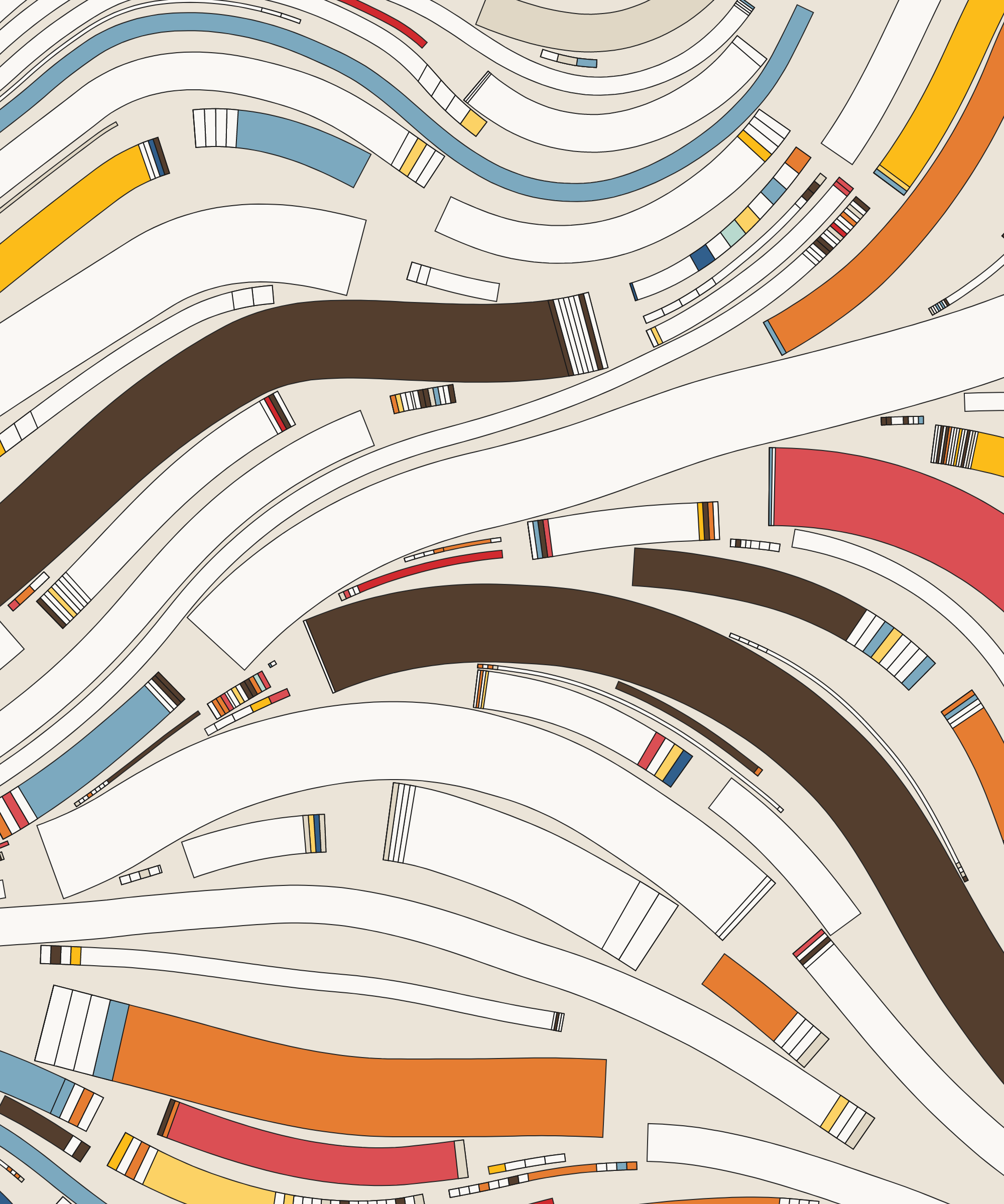 Fidenza is by far my most versatile algorithm to date. Although the program stays focused on structured curves and blocks, the varieties of scale, organization, texture, and color usage it can employ create a wide array of generative possibilities.