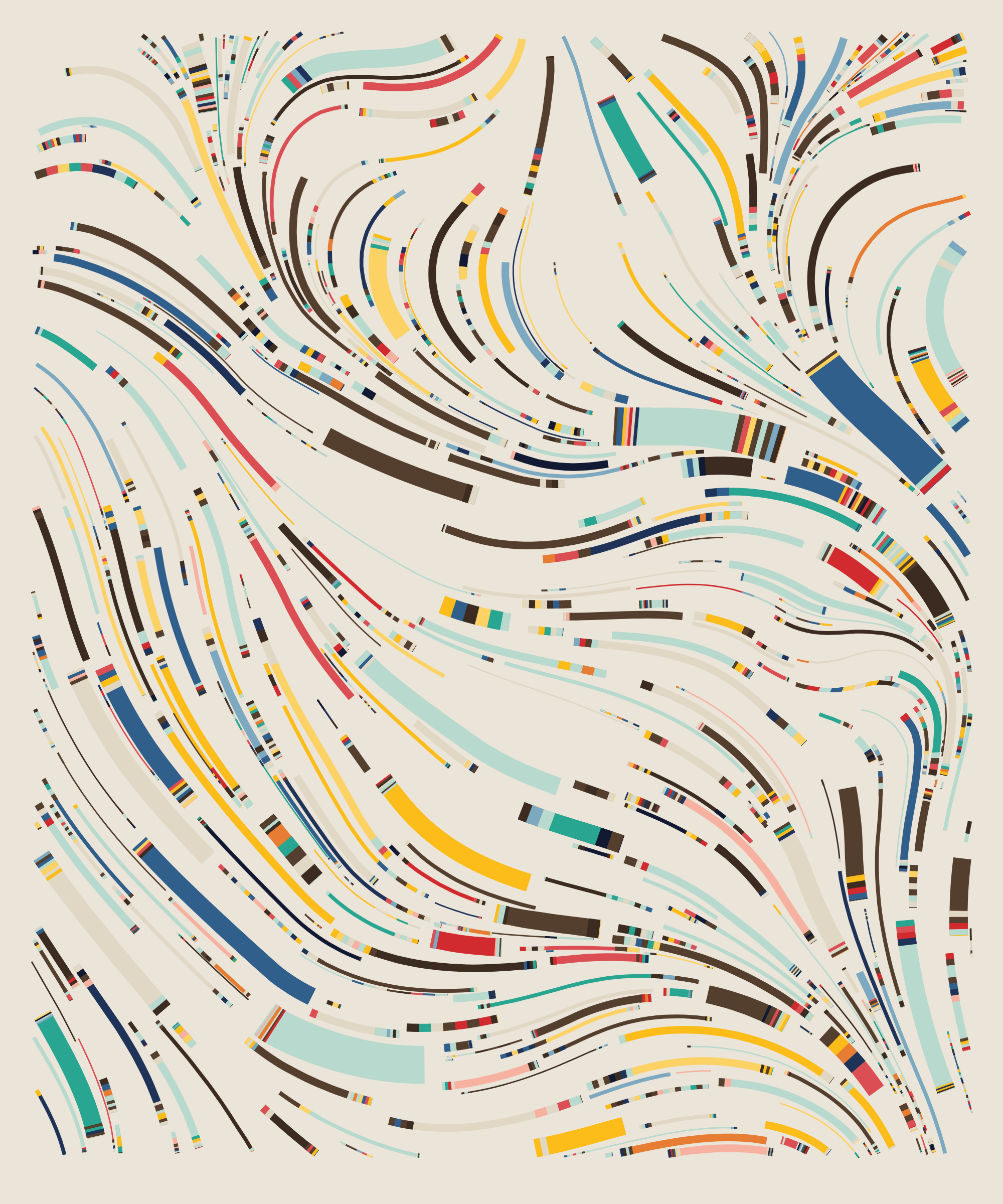 Fidenza is by far my most versatile algorithm to date. Although the program stays focused on structured curves and blocks, the varieties of scale, organization, texture, and color usage it can employ create a wide array of generative possibilities.