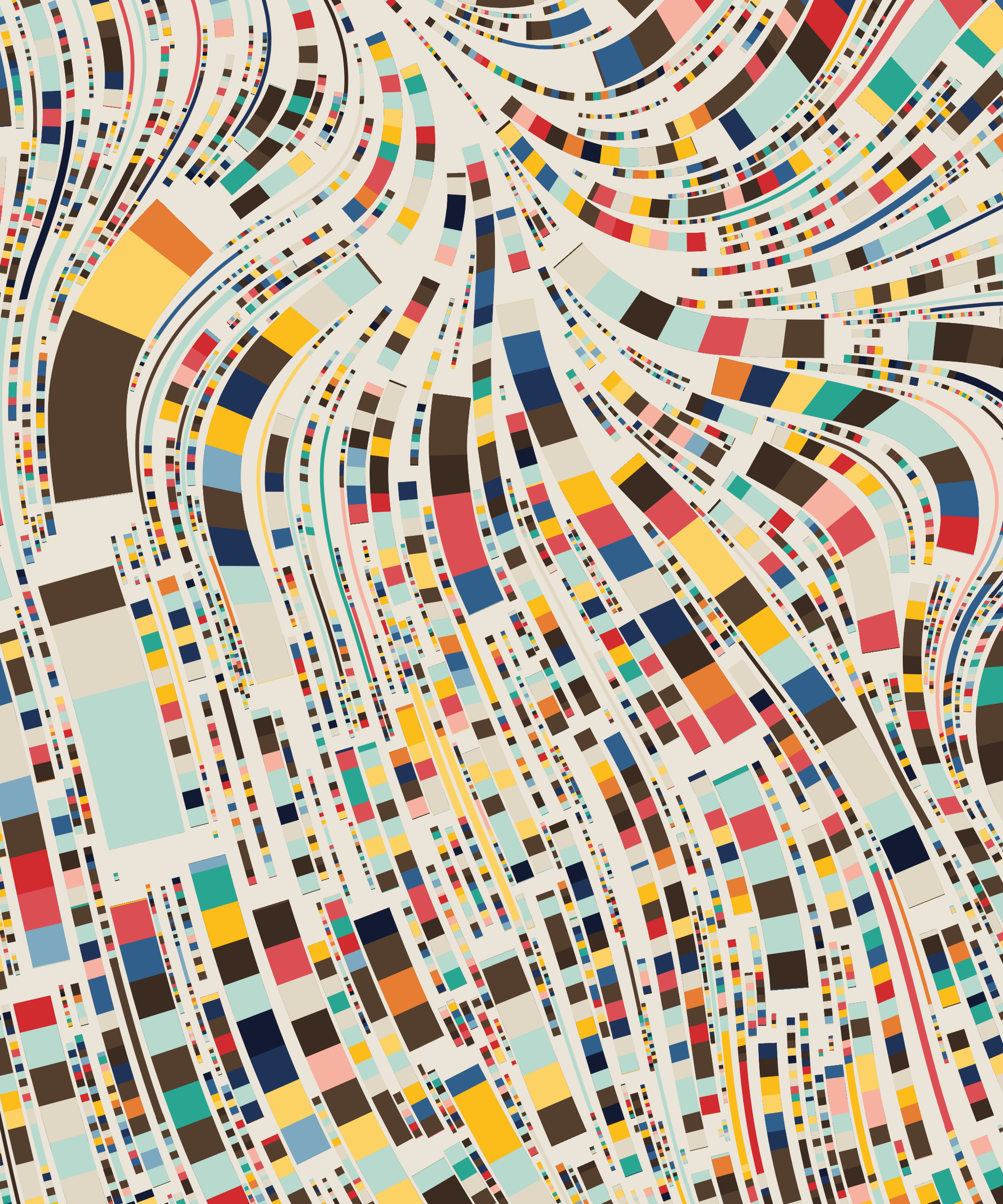 Fidenza is by far my most versatile algorithm to date. Although the program stays focused on structured curves and blocks, the varieties of scale, organization, texture, and color usage it can employ create a wide array of generative possibilities.