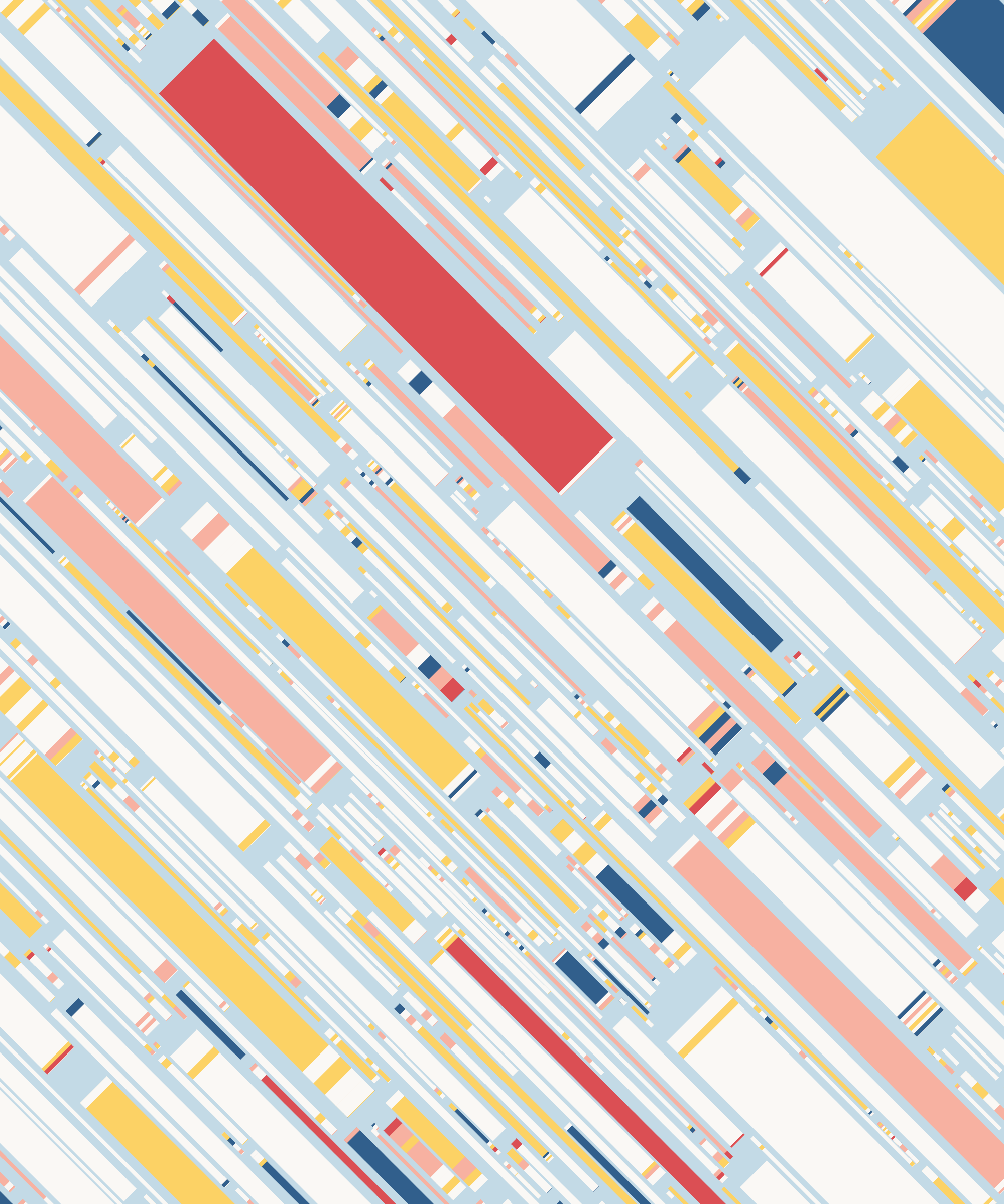 Fidenza is by far my most versatile algorithm to date. Although the program stays focused on structured curves and blocks, the varieties of scale, organization, texture, and color usage it can employ create a wide array of generative possibilities.