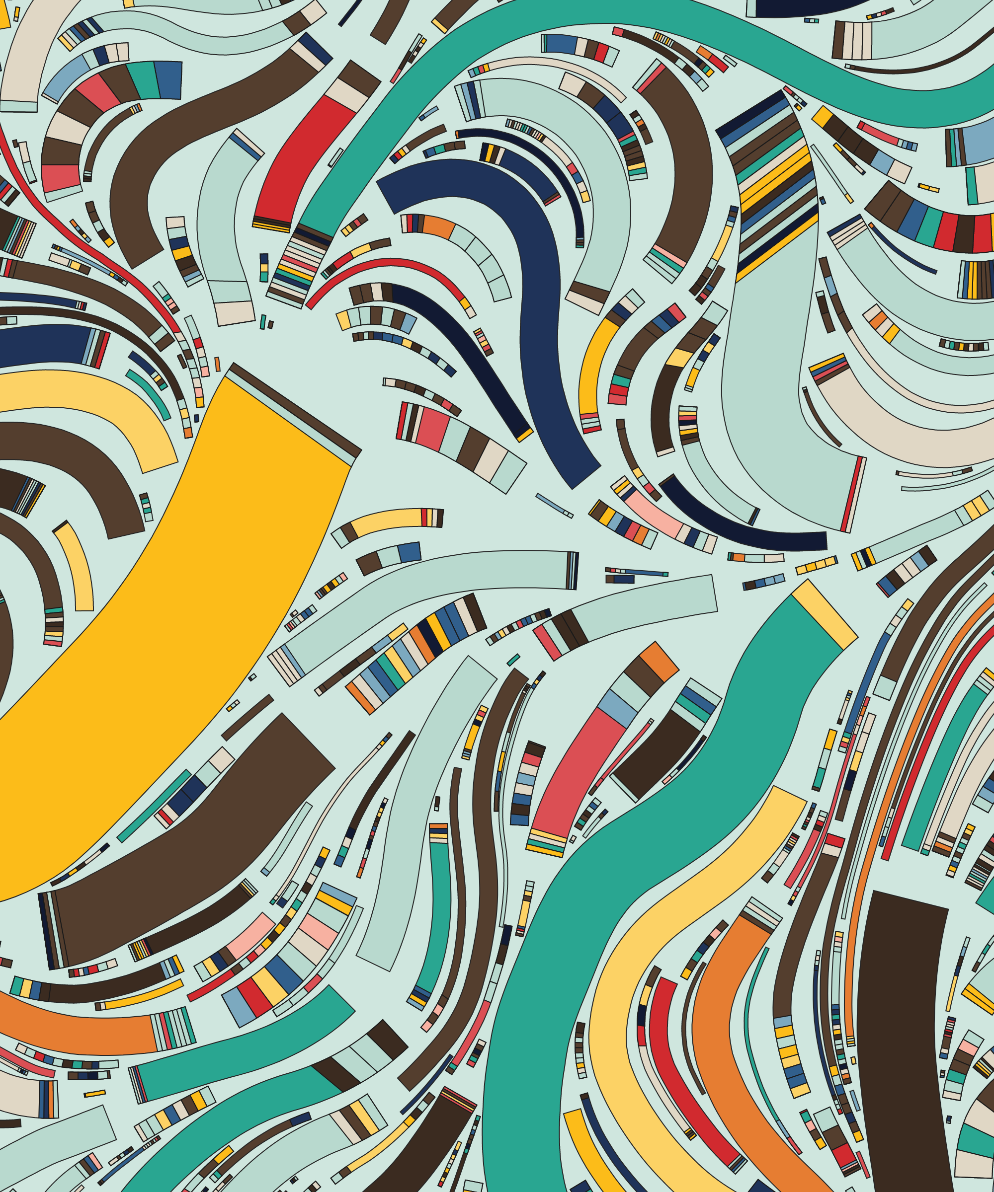 Fidenza is by far my most versatile algorithm to date. Although the program stays focused on structured curves and blocks, the varieties of scale, organization, texture, and color usage it can employ create a wide array of generative possibilities.