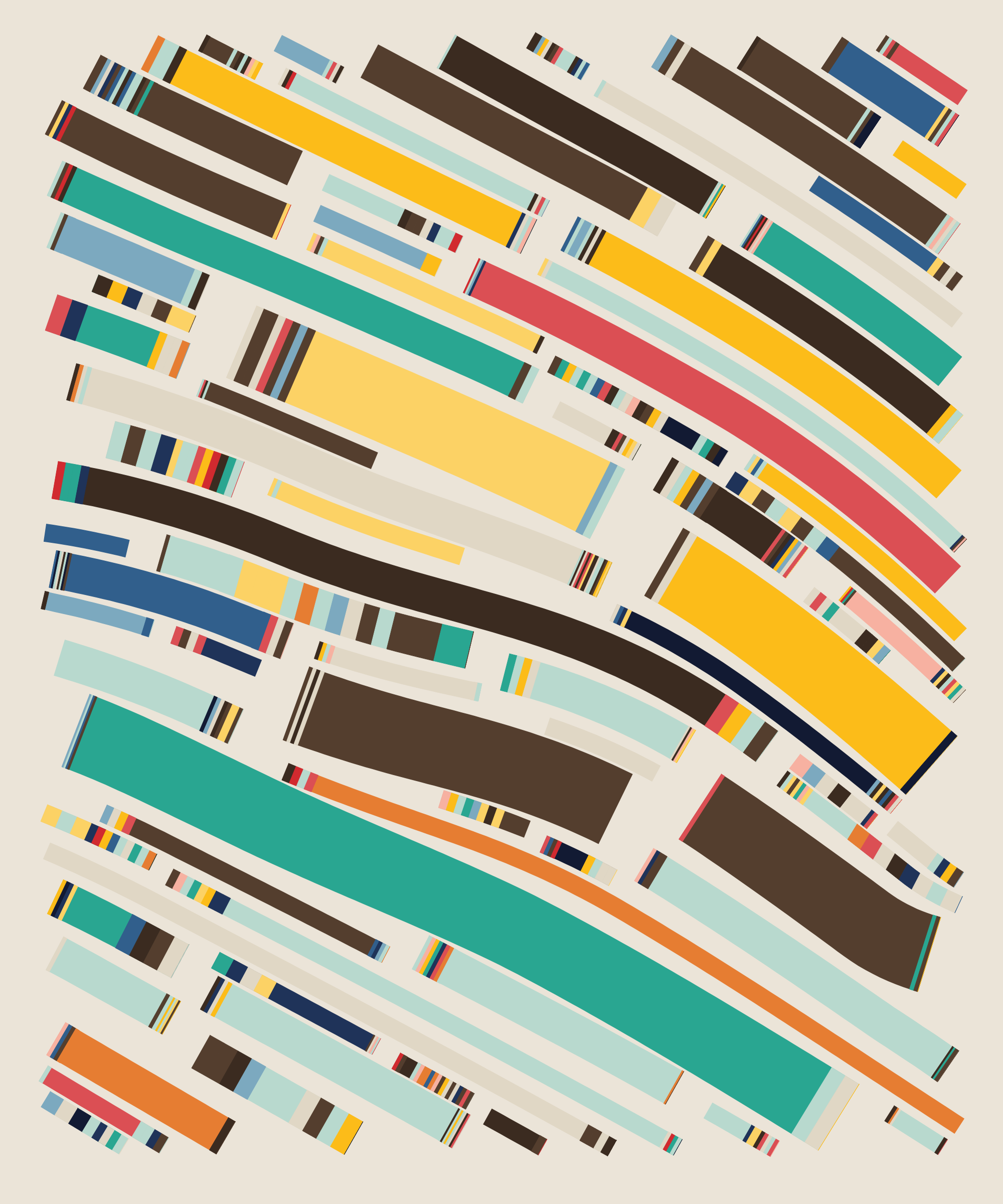 Fidenza is by far my most versatile algorithm to date. Although the program stays focused on structured curves and blocks, the varieties of scale, organization, texture, and color usage it can employ create a wide array of generative possibilities.