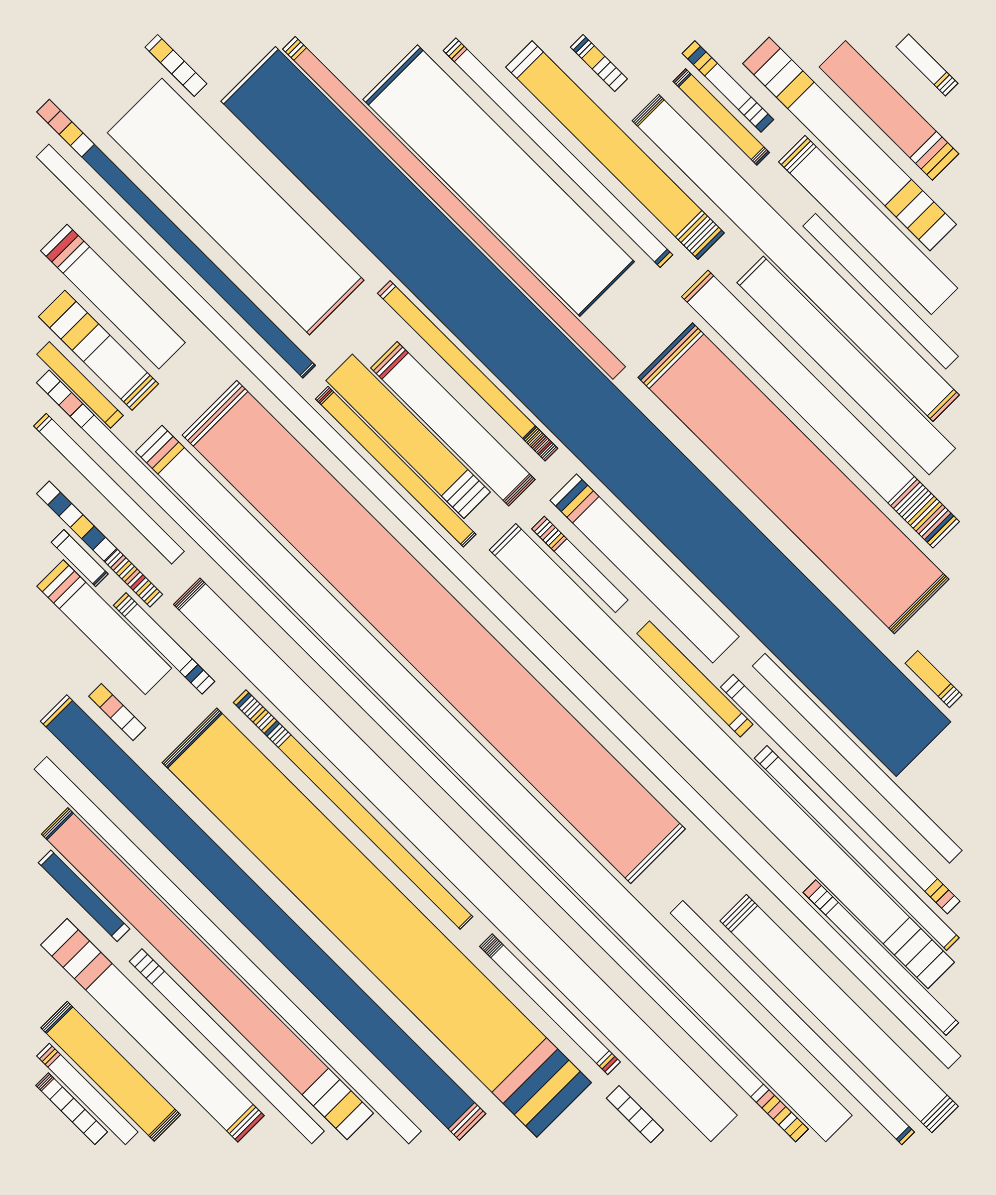 Fidenza is by far my most versatile algorithm to date. Although the program stays focused on structured curves and blocks, the varieties of scale, organization, texture, and color usage it can employ create a wide array of generative possibilities.