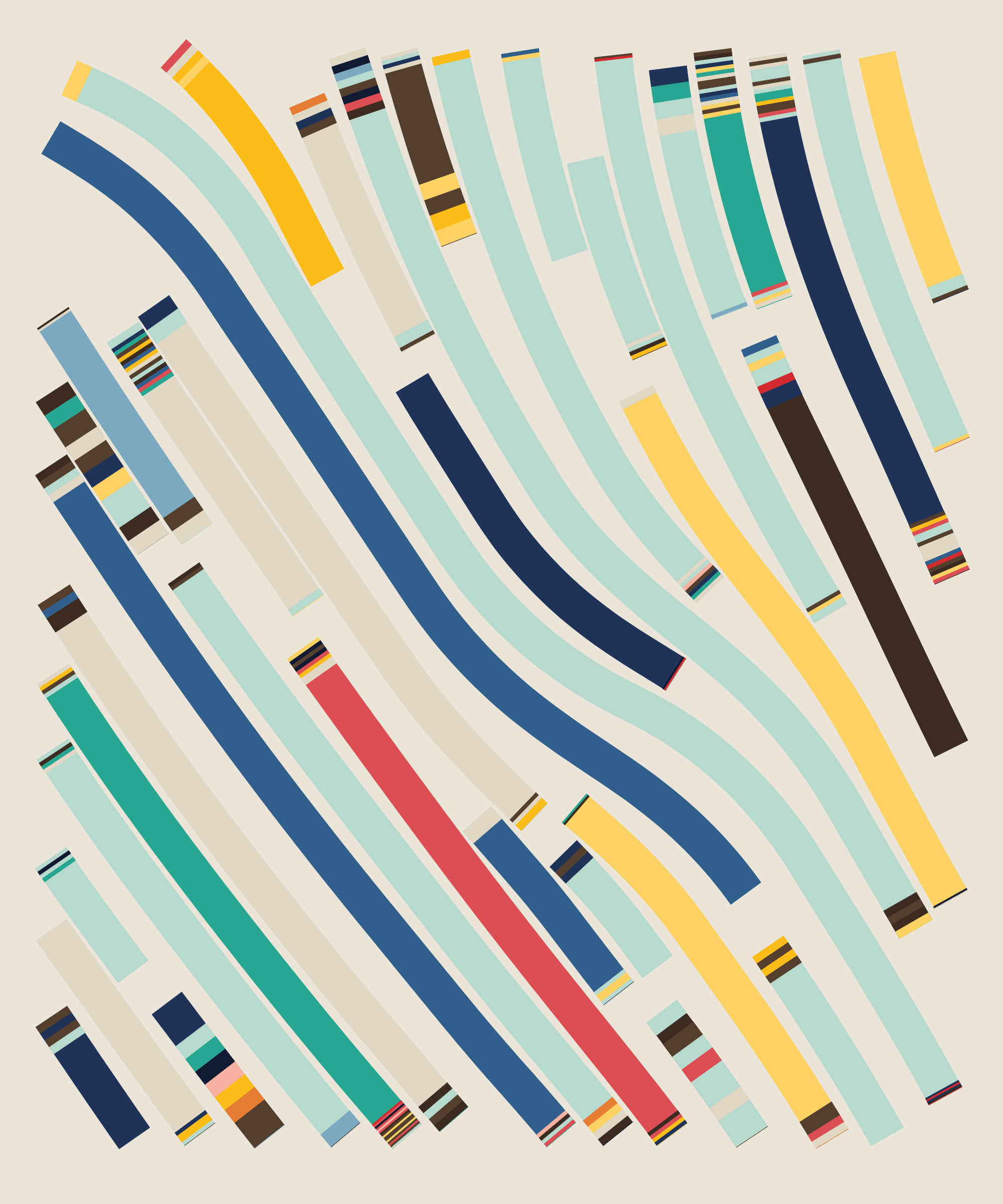 Fidenza is by far my most versatile algorithm to date. Although the program stays focused on structured curves and blocks, the varieties of scale, organization, texture, and color usage it can employ create a wide array of generative possibilities.