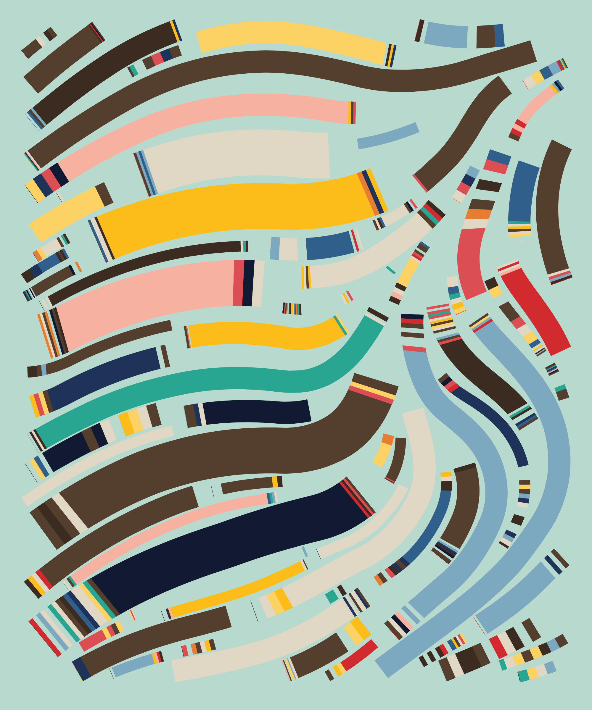 Fidenza is by far my most versatile algorithm to date. Although the program stays focused on structured curves and blocks, the varieties of scale, organization, texture, and color usage it can employ create a wide array of generative possibilities.