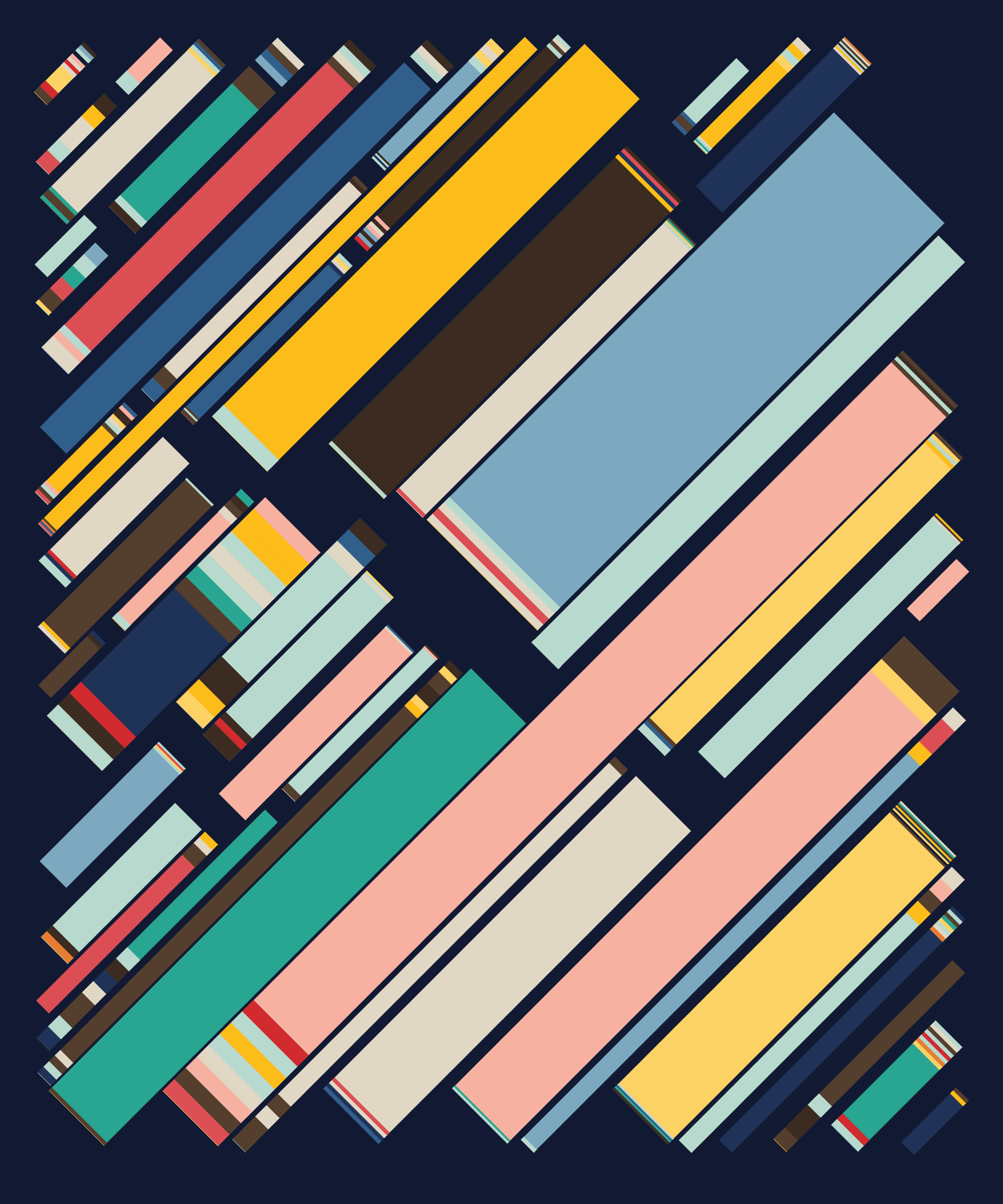 Fidenza is by far my most versatile algorithm to date. Although the program stays focused on structured curves and blocks, the varieties of scale, organization, texture, and color usage it can employ create a wide array of generative possibilities.