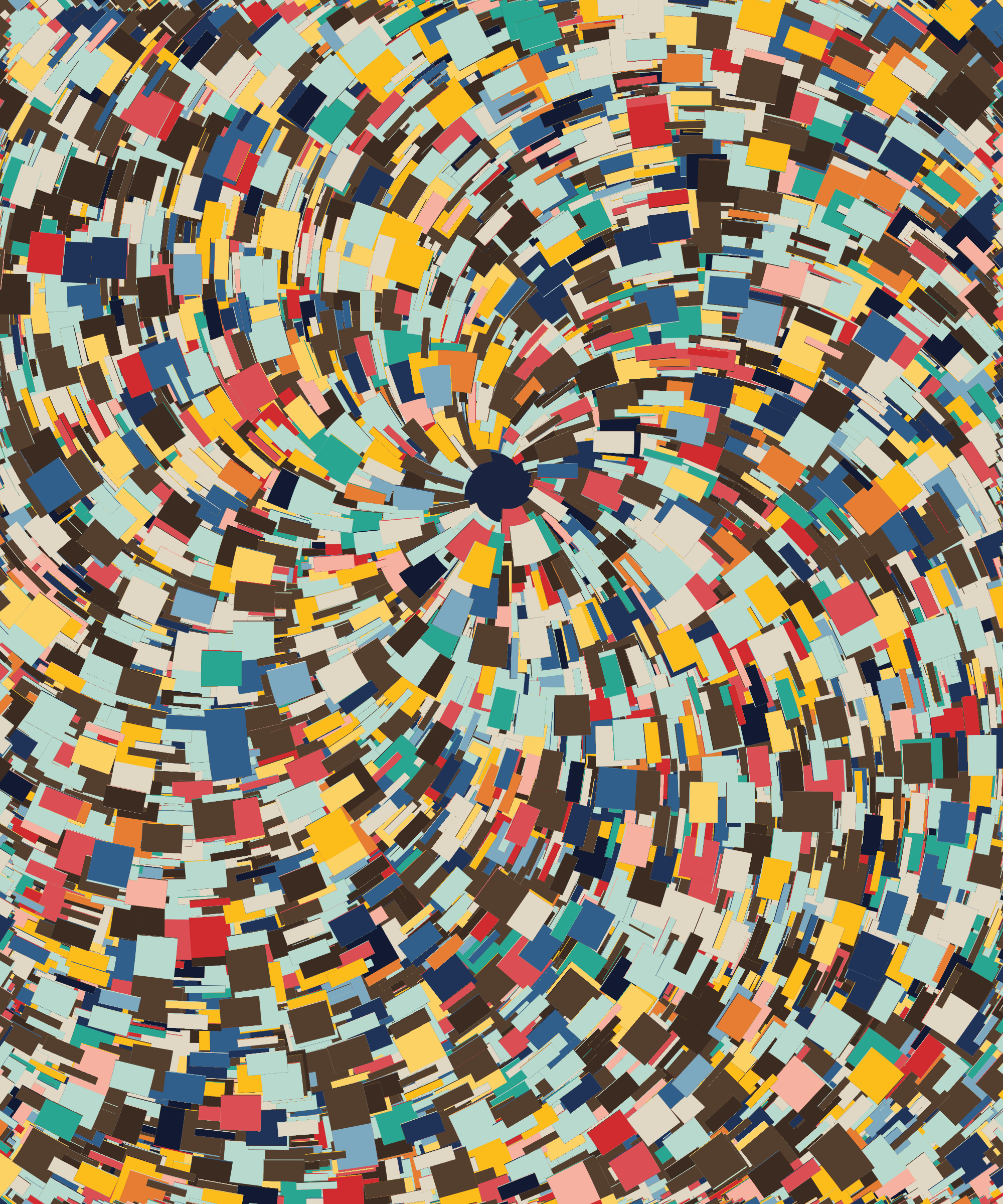 Fidenza is by far my most versatile algorithm to date. Although the program stays focused on structured curves and blocks, the varieties of scale, organization, texture, and color usage it can employ create a wide array of generative possibilities.