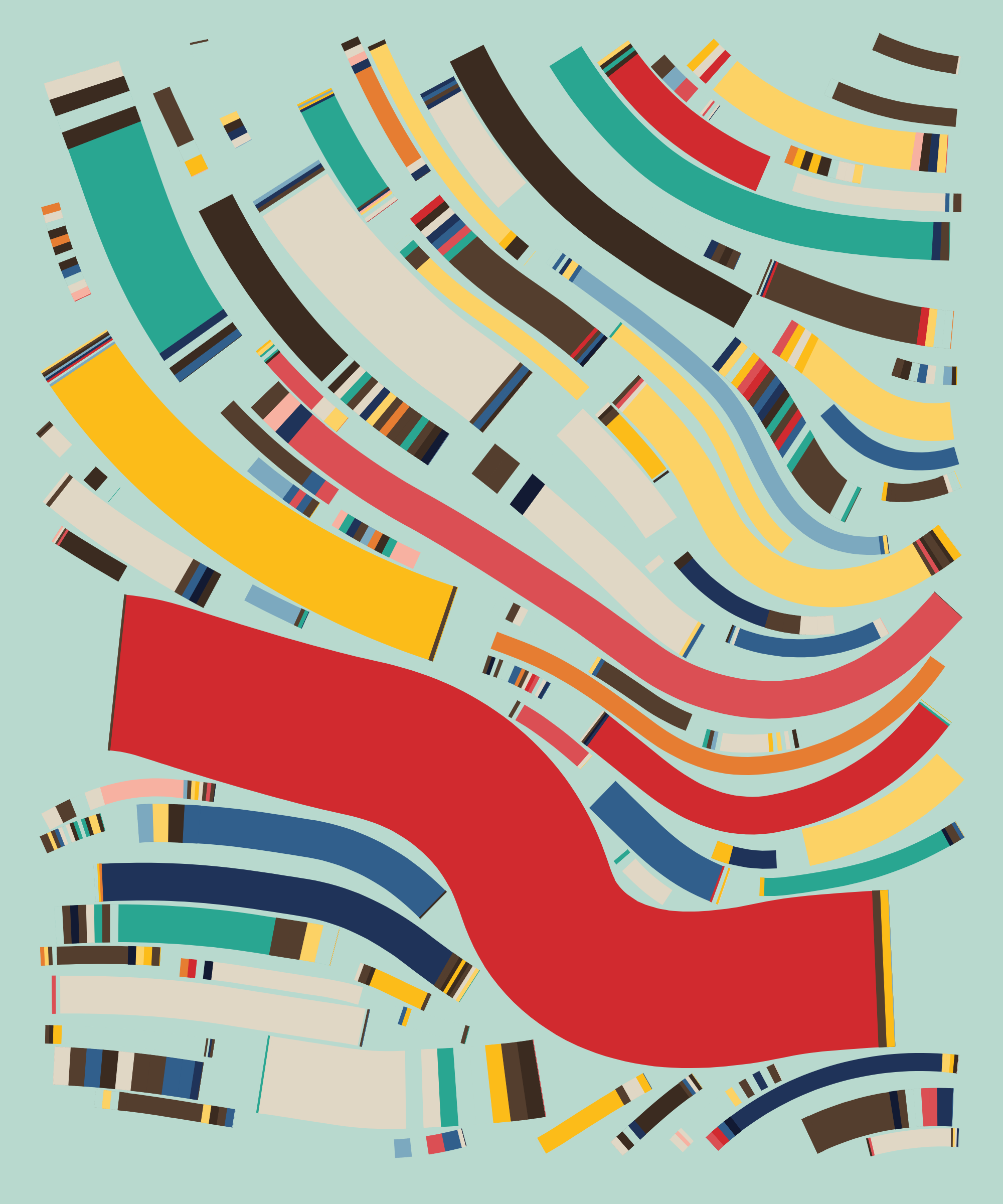 Fidenza is by far my most versatile algorithm to date. Although the program stays focused on structured curves and blocks, the varieties of scale, organization, texture, and color usage it can employ create a wide array of generative possibilities.