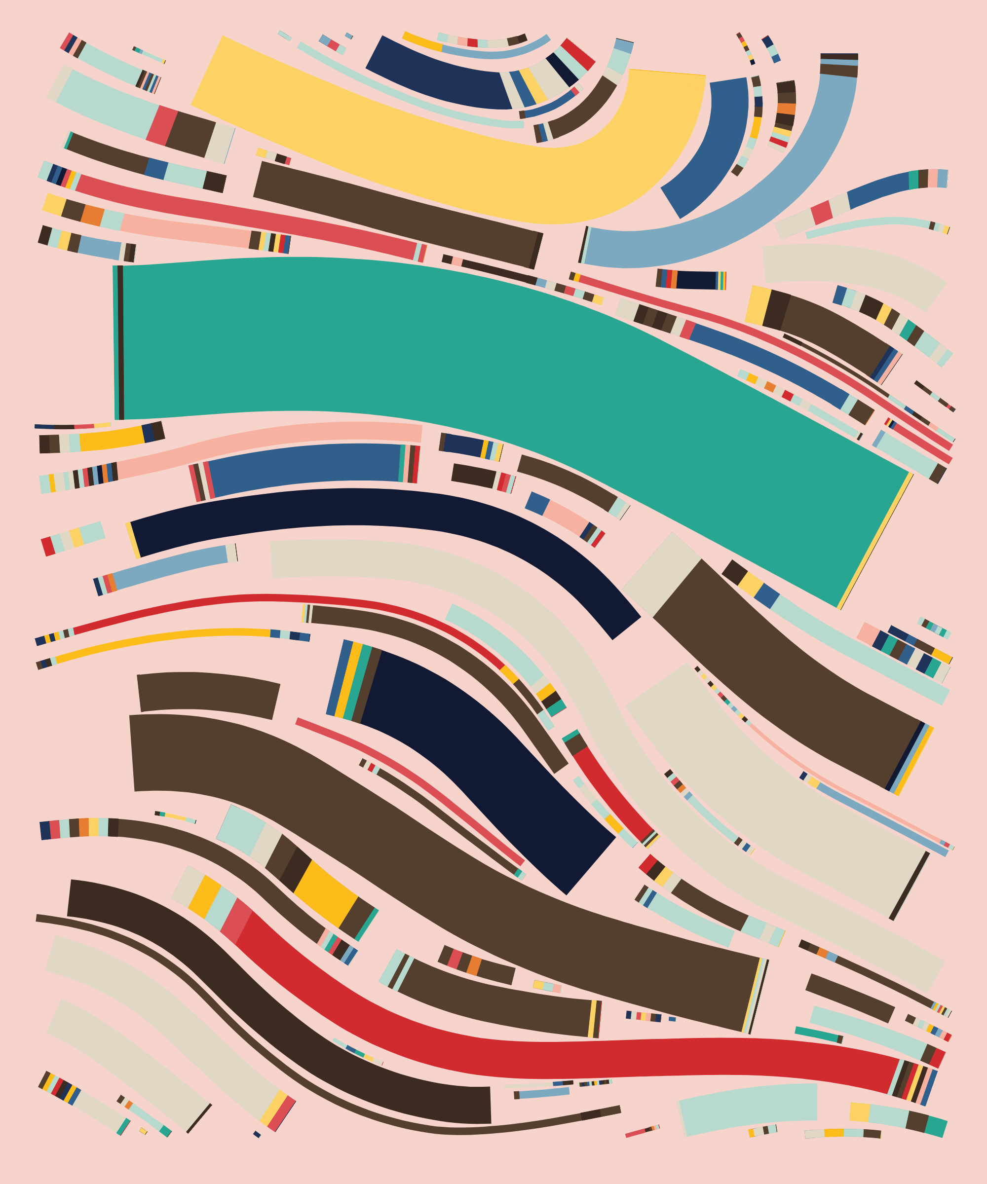 Fidenza is by far my most versatile algorithm to date. Although the program stays focused on structured curves and blocks, the varieties of scale, organization, texture, and color usage it can employ create a wide array of generative possibilities.