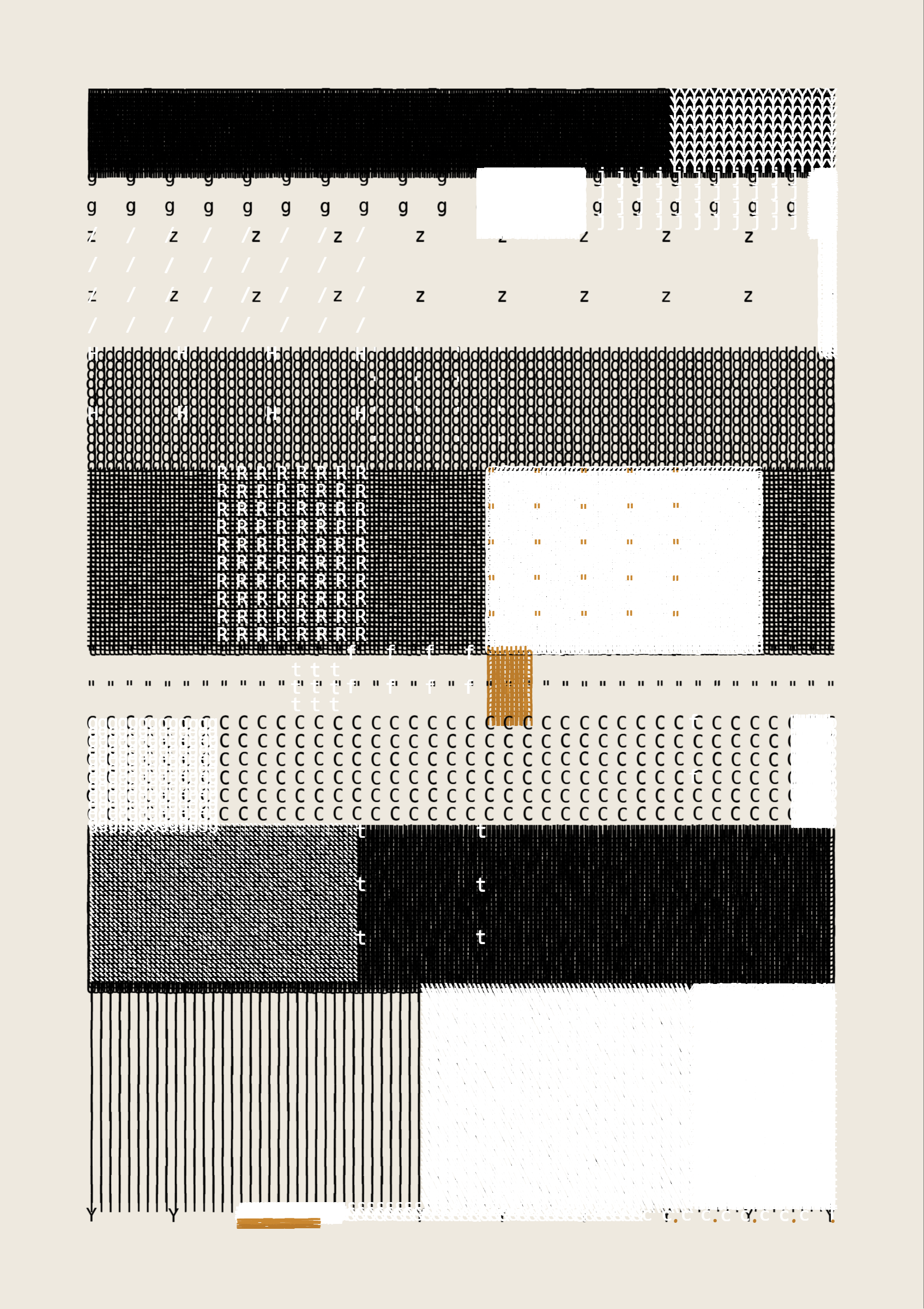 FOLIO is a generative drawing system, inspired by concrete poetry and early computer artwork, that emits an output process for a given input. Each output may be realized digitally, in print, or through another medium. The drawing system, coded in JavaScript, recursively packs bins of data to fill the page, constrained entirely by the use of typographic glyphs and a limited mono-, duo-, or tri-colour palette.