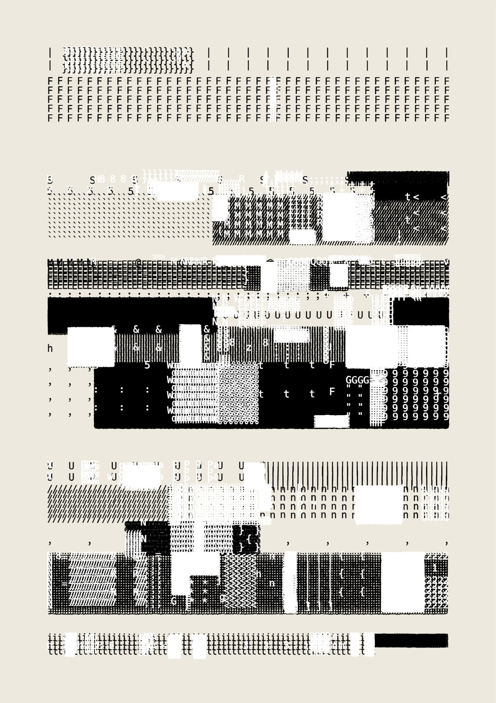 FOLIO is a generative drawing system, inspired by concrete poetry and early computer artwork, that emits an output process for a given input. Each output may be realized digitally, in print, or through another medium. The drawing system, coded in JavaScript, recursively packs bins of data to fill the page, constrained entirely by the use of typographic glyphs and a limited mono-, duo-, or tri-colour palette.