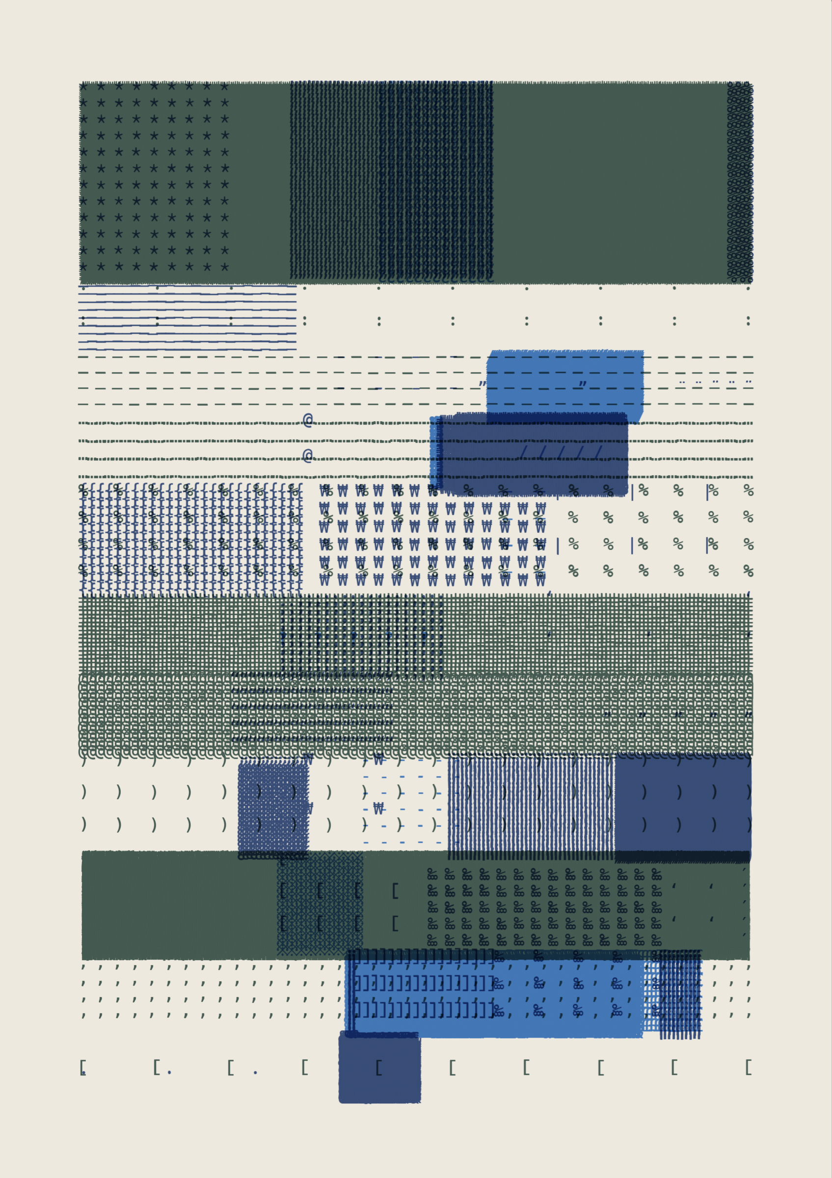 FOLIO is a generative drawing system, inspired by concrete poetry and early computer artwork, that emits an output process for a given input. Each output may be realized digitally, in print, or through another medium. The drawing system, coded in JavaScript, recursively packs bins of data to fill the page, constrained entirely by the use of typographic glyphs and a limited mono-, duo-, or tri-colour palette.