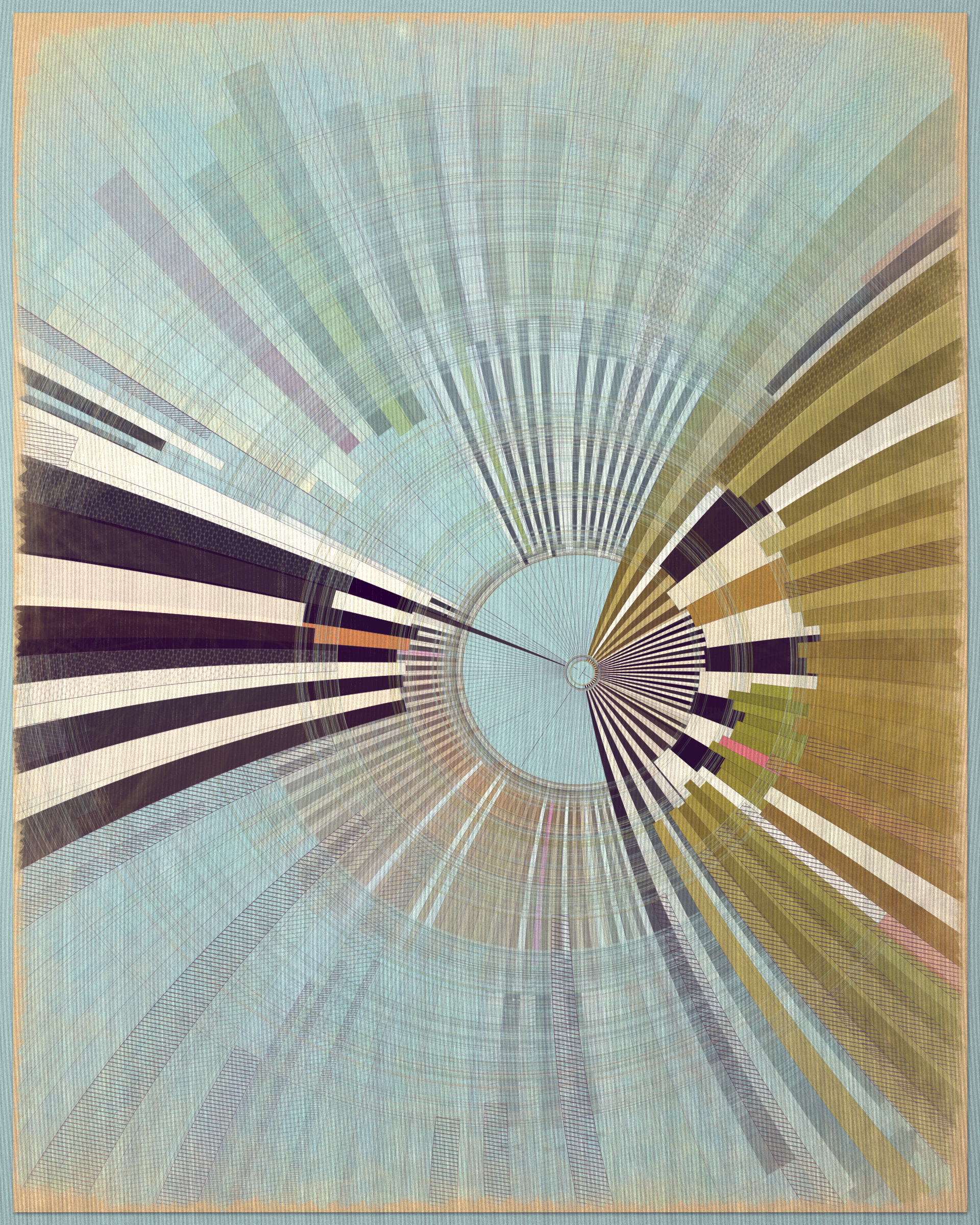 This project is a playful attempt at abstractly capturing the flowing movement of a fountain using precisely drawn elements that evoke a static and considered rendering of a subject that is in constant flux. The visual language is reminiscent of hand-draughted technical drawing, a precise and methodical practice that progresses at a radically different pace to the flowing and capricious movement of water. To increase this tension between dynamic motion and static mechanical process I wanted the surface textures to appear worn and aged like a drawing that has spent its life in the bottom of a mechanics drawer. This process of abrasion and discoloration is occurring on yet another scale of time adding complexity to the references of time passing.