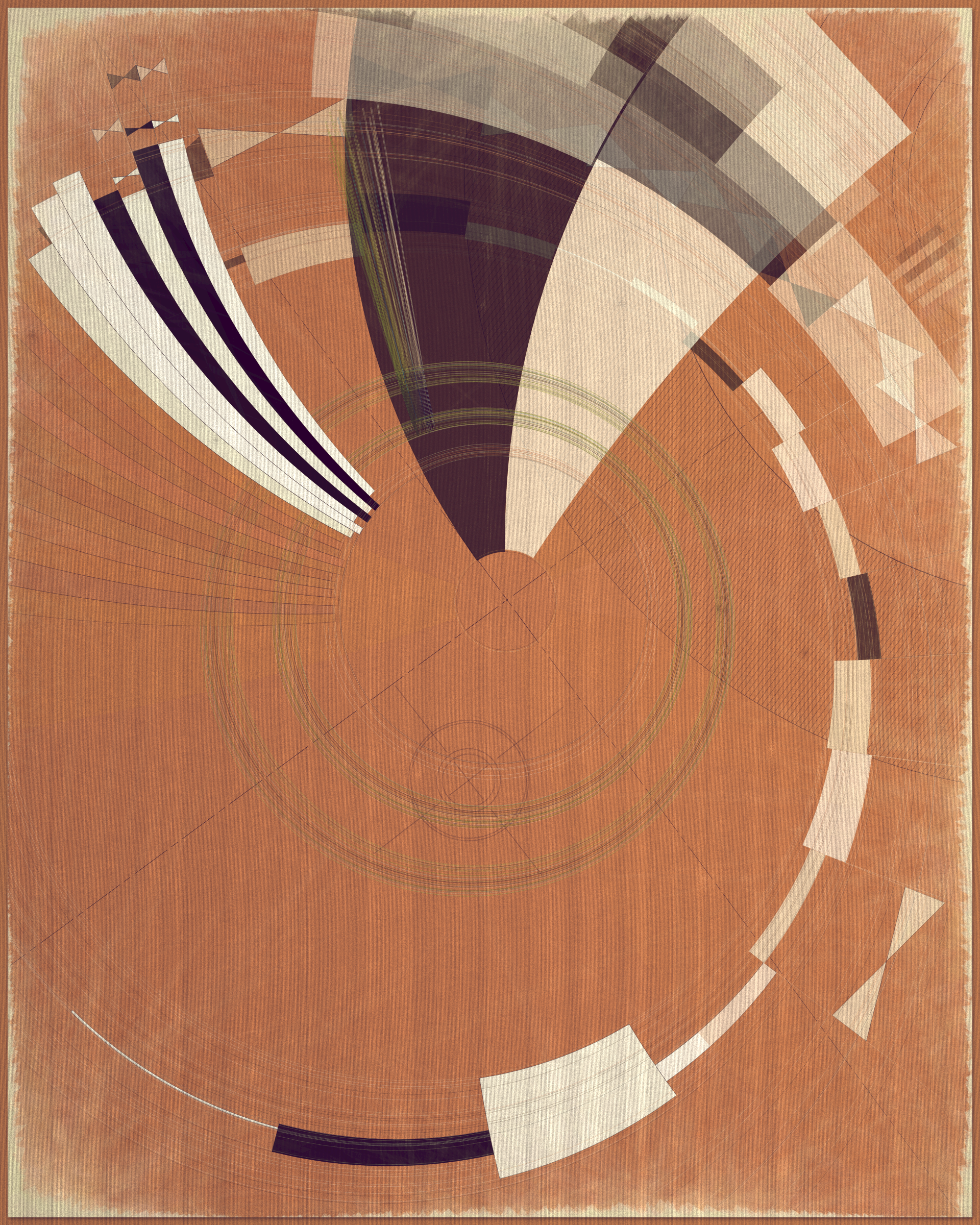 This project is a playful attempt at abstractly capturing the flowing movement of a fountain using precisely drawn elements that evoke a static and considered rendering of a subject that is in constant flux. The visual language is reminiscent of hand-draughted technical drawing, a precise and methodical practice that progresses at a radically different pace to the flowing and capricious movement of water. To increase this tension between dynamic motion and static mechanical process I wanted the surface textures to appear worn and aged like a drawing that has spent its life in the bottom of a mechanics drawer. This process of abrasion and discoloration is occurring on yet another scale of time adding complexity to the references of time passing.
