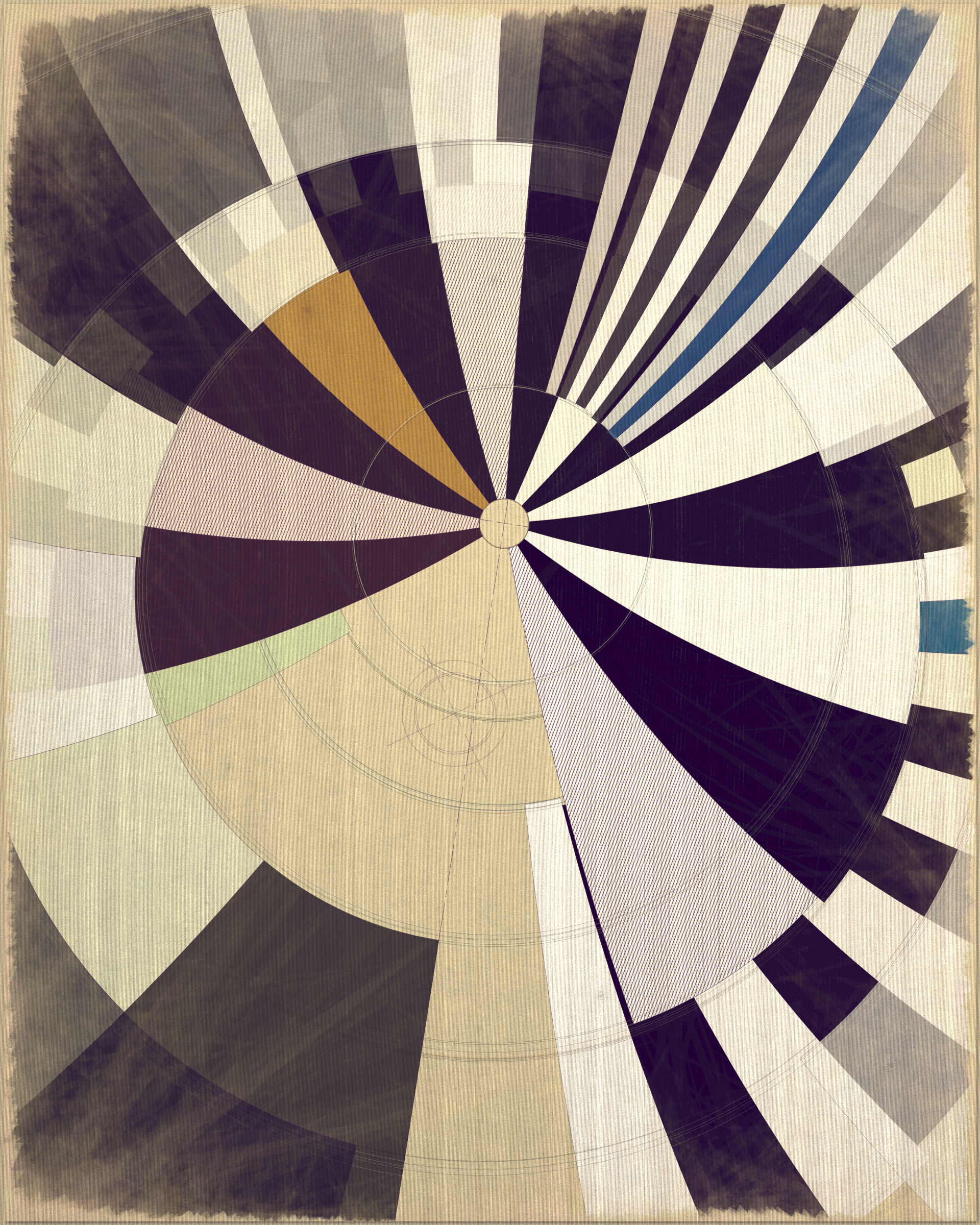 This project is a playful attempt at abstractly capturing the flowing movement of a fountain using precisely drawn elements that evoke a static and considered rendering of a subject that is in constant flux. The visual language is reminiscent of hand-draughted technical drawing, a precise and methodical practice that progresses at a radically different pace to the flowing and capricious movement of water. To increase this tension between dynamic motion and static mechanical process I wanted the surface textures to appear worn and aged like a drawing that has spent its life in the bottom of a mechanics drawer. This process of abrasion and discoloration is occurring on yet another scale of time adding complexity to the references of time passing.