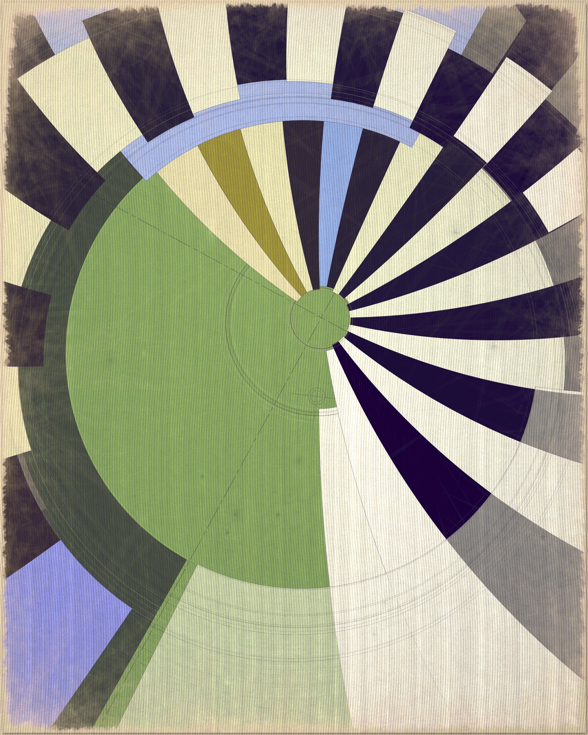 This project is a playful attempt at abstractly capturing the flowing movement of a fountain using precisely drawn elements that evoke a static and considered rendering of a subject that is in constant flux. The visual language is reminiscent of hand-draughted technical drawing, a precise and methodical practice that progresses at a radically different pace to the flowing and capricious movement of water. To increase this tension between dynamic motion and static mechanical process I wanted the surface textures to appear worn and aged like a drawing that has spent its life in the bottom of a mechanics drawer. This process of abrasion and discoloration is occurring on yet another scale of time adding complexity to the references of time passing.