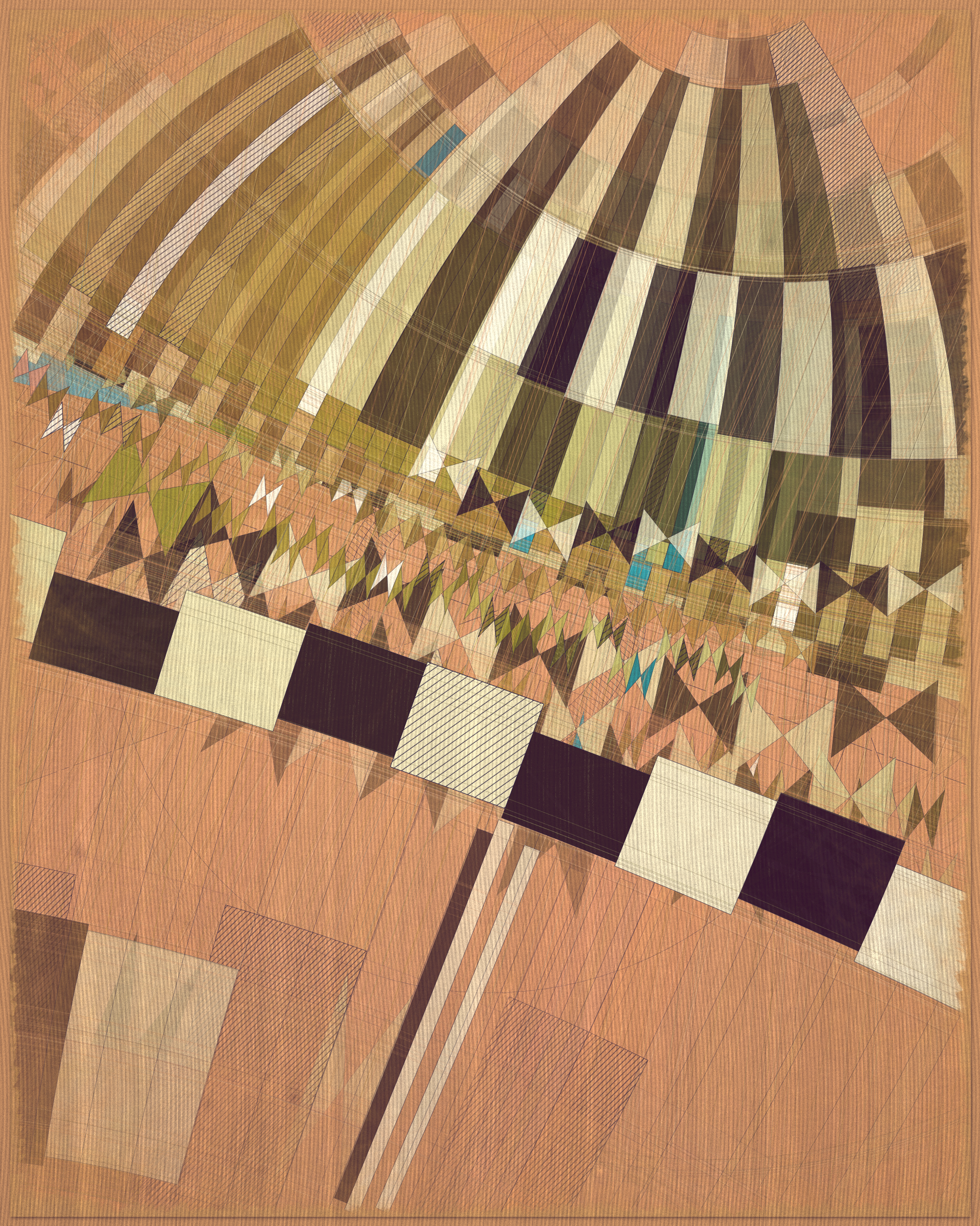 This project is a playful attempt at abstractly capturing the flowing movement of a fountain using precisely drawn elements that evoke a static and considered rendering of a subject that is in constant flux. The visual language is reminiscent of hand-draughted technical drawing, a precise and methodical practice that progresses at a radically different pace to the flowing and capricious movement of water. To increase this tension between dynamic motion and static mechanical process I wanted the surface textures to appear worn and aged like a drawing that has spent its life in the bottom of a mechanics drawer. This process of abrasion and discoloration is occurring on yet another scale of time adding complexity to the references of time passing.