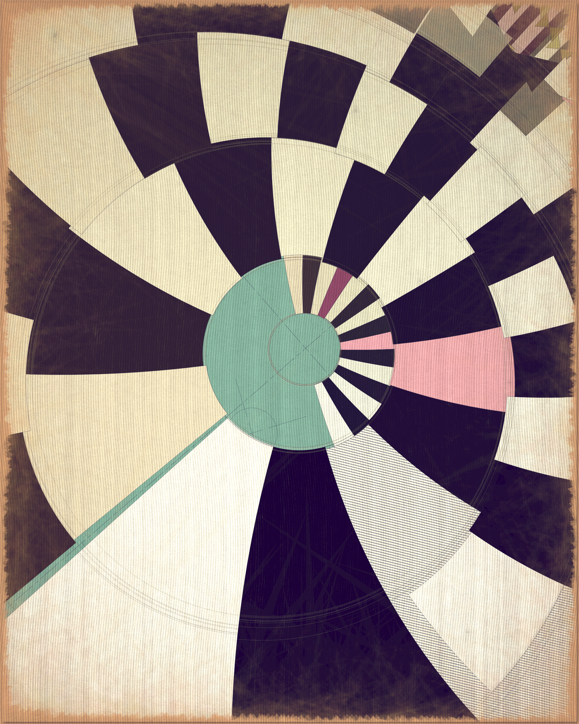 This project is a playful attempt at abstractly capturing the flowing movement of a fountain using precisely drawn elements that evoke a static and considered rendering of a subject that is in constant flux. The visual language is reminiscent of hand-draughted technical drawing, a precise and methodical practice that progresses at a radically different pace to the flowing and capricious movement of water. To increase this tension between dynamic motion and static mechanical process I wanted the surface textures to appear worn and aged like a drawing that has spent its life in the bottom of a mechanics drawer. This process of abrasion and discoloration is occurring on yet another scale of time adding complexity to the references of time passing.